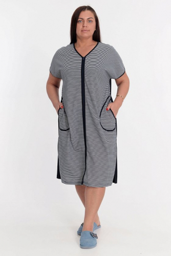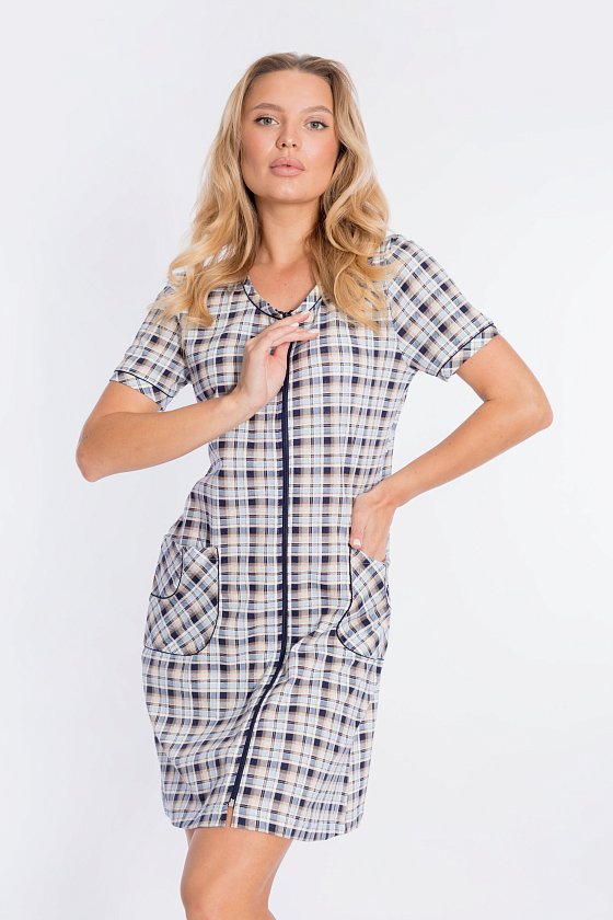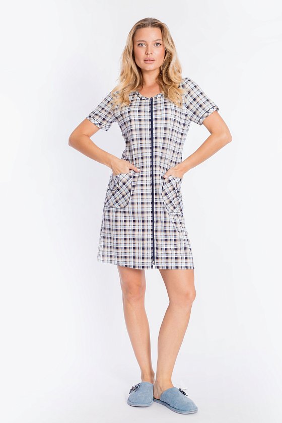 Халат с застёжкой на молнию выполнен из кулирки, 100% хлопок. Рукава короткие, спереди два накладных кармана. Вырез горловины, низ рукавов и карманы украшены отделочным кантом.