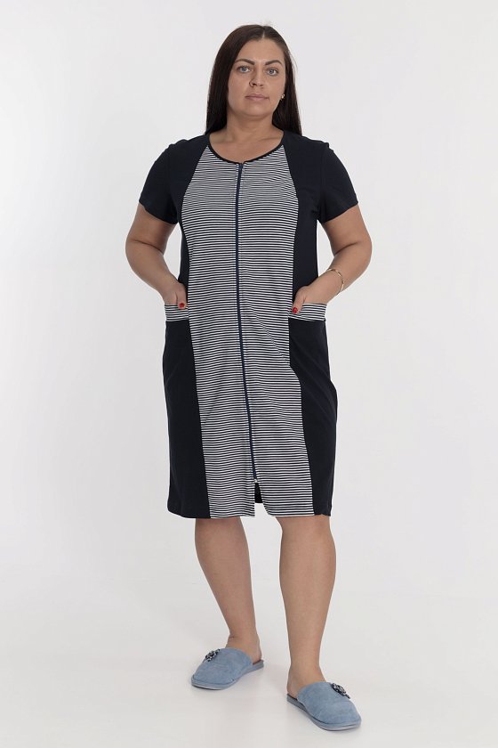 Халат выполнен из кулирки, 100% хлопок. С короткими рукавами и центральной застёжкой на молнию. По бокам расположены два кармана. Круглый вырез горловины оформлен бейкой.