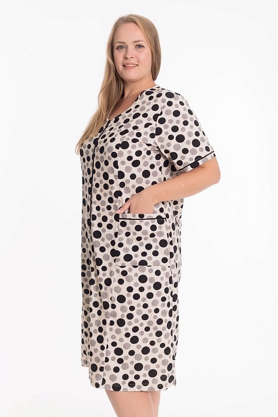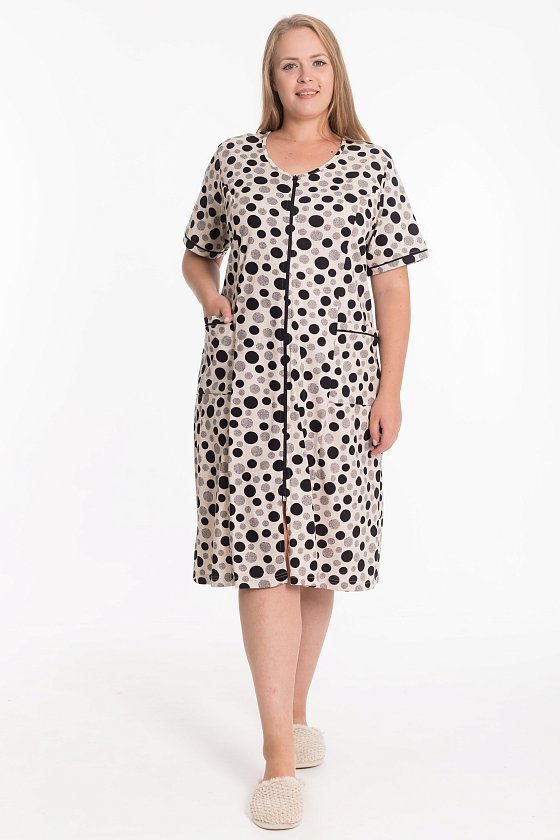 Халат с коротким рукавом на молнии — удобная и практичная модель для повседневной носки. На спинке расположен средний шов, обеспечивающий хорошую посадку по фигуре. Полочки оформлены рельефными линиями, между которыми и боковыми швами размещены накладные карманы. Внизу боковых швов предусмотрены небольшие разрезы для свободы движения. В швах притачивания планок рукавов и карманов аккуратно вставлен кант, который придаёт изделию законченный и стильный вид.