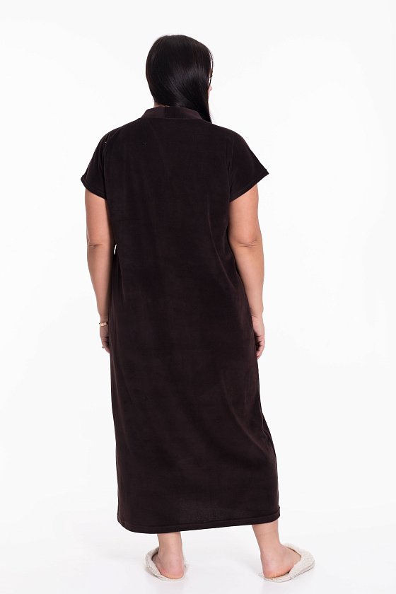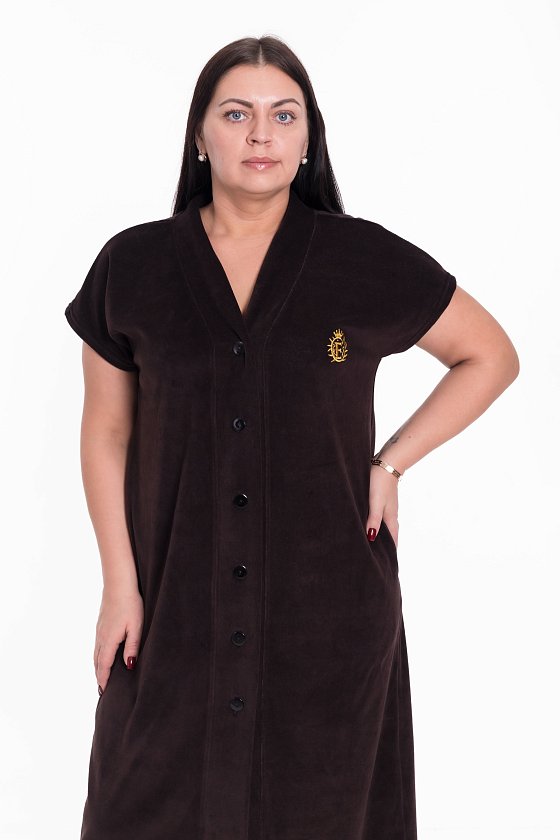 Женский халат — отличный выбор для домашнего отдыха. Халат выполнен из мягкого и приятного на ощупь однотонного велюра, который обеспечивает комфорт и тепло. Халат имеет свободный крой и застёгивается на пуговицы по всей длине. V-образный вырез горловины придаёт изделию стильный вид, с левой стороны расположена вышивка, которая добавляет изюминку в дизайн. Боковые карманы придают модели оригинальность. Такой халат станет отличным выбором одежды для дома.