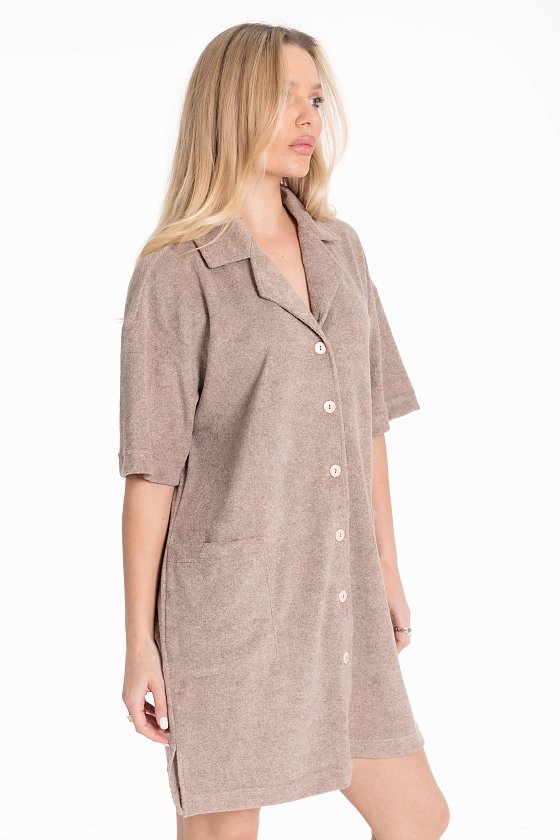 Женский халат — идеальный вариант для домашнего отдыха. Он выполнен из мягкой и приятной на ощупь махровой ткани, которая обеспечивает комфорт и тепло. Халат имеет прямой силуэт и спущенную линию плеча. Рукава доходят до локтя, обеспечивая удобство и свободу движений. Отложной воротник и застёжка на пуговицах делают халат стильным. Накладные карманы и разрезы по бокам добавляют изделию функциональности и оригинальности. Изготовленный из натуральной ткани, халат обеспечит комфорт в течение всего дня.