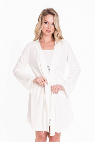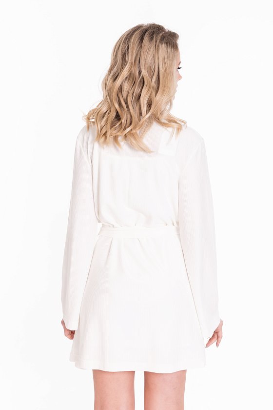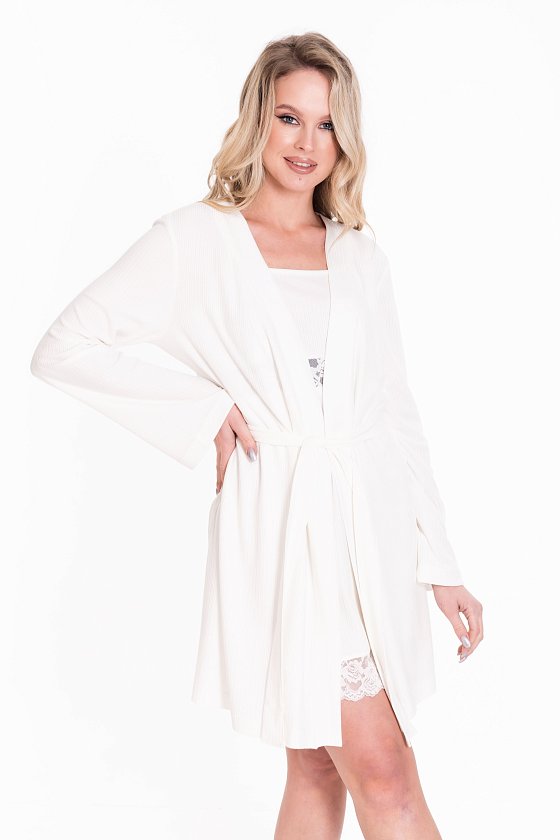 Женский халат на запах выполнен из однотонного полотна интерлок ринг-вискон. Без воротника, с притачной планкой по борту. Рукава расклешенные. Халат фиксируется на талии поясом, пропущенным через шлёвки.