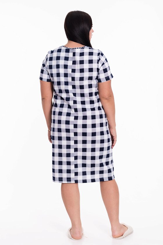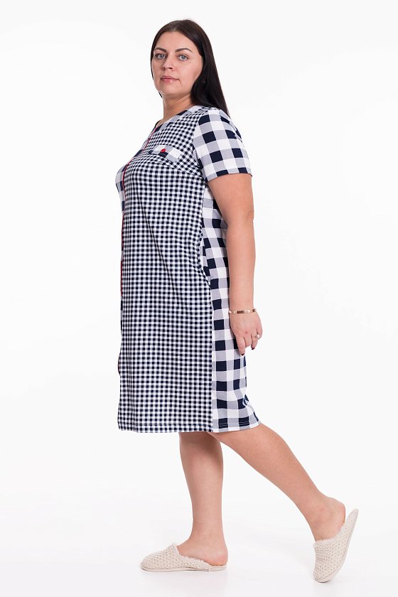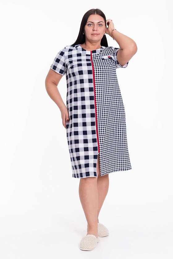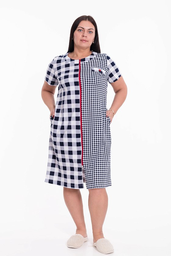 Женский халат на молнии выполнен из лёгкой хлопковой ткани с комбинацией двух расцветок-компаньонов. Рукава короткие, силуэт халата прямой, по бокам расположены карманы.