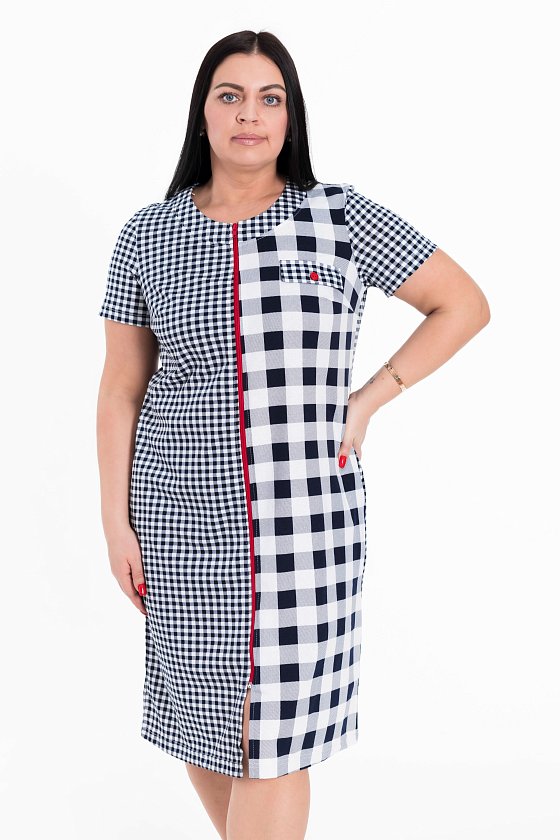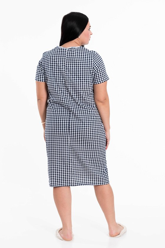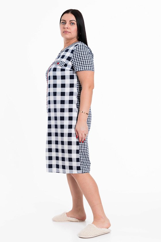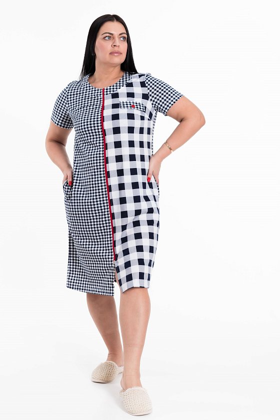 Женский халат на молнии выполнен из лёгкой хлопковой ткани с комбинацией двух расцветок-компаньонов. Рукава короткие, силуэт халата прямой, по бокам расположены карманы.
