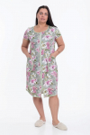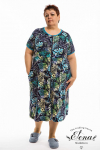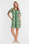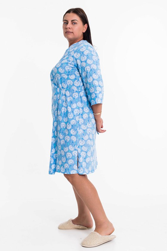 Халат выполнен из хлопкового полотна. Рукава длиной 3/4, полочки запахиваются и завязываются на пояс. По бокам есть карманы.