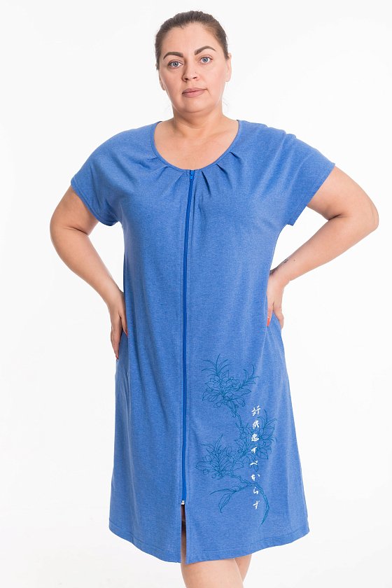 Женский халат выполнен из кулирного хлопкового полотна, что обеспечивает комфорт и удобство в носке. Модель со спущенной линией плеча, застежкой на молнии и двумя карманами в боковых швах. Горловина обработана бейкой и украшена декоративными защипами. Спереди внизу расположен стильный принт, добавляющий образу оригинальности.