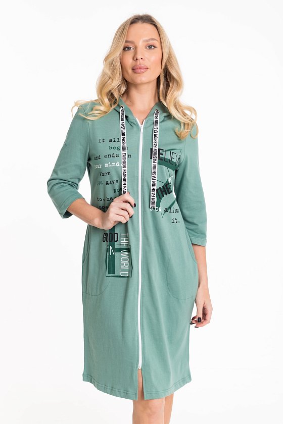 Халат выполнен из однотонной кулирки и застёгивается на молнию. Халат дополнен удобным капюшоном, который регулируется репсовой лентой. Модель имеет втачной рукав длиной 3/4 и карманы в боковых швах. Спереди полочки украшены стильными принтами, придающими образу оригинальность.