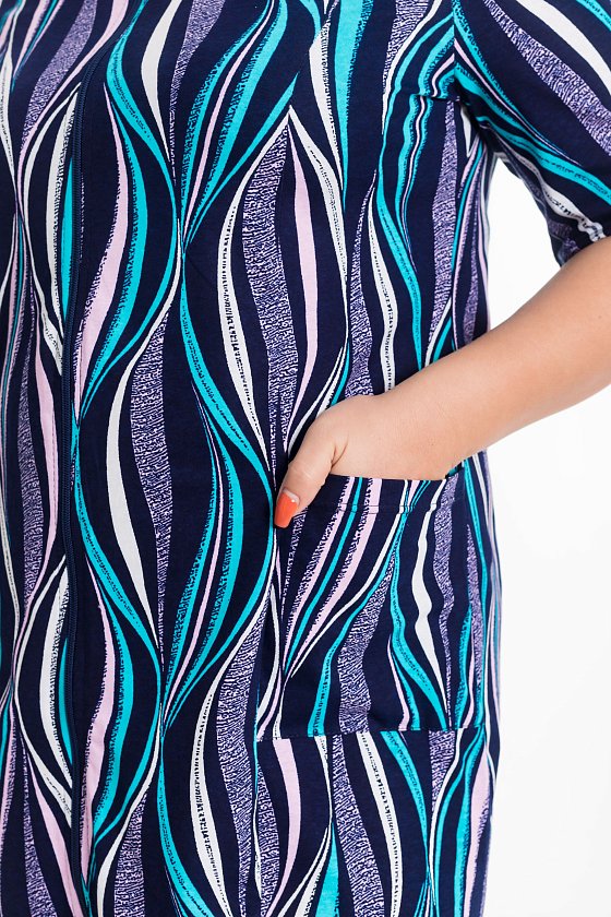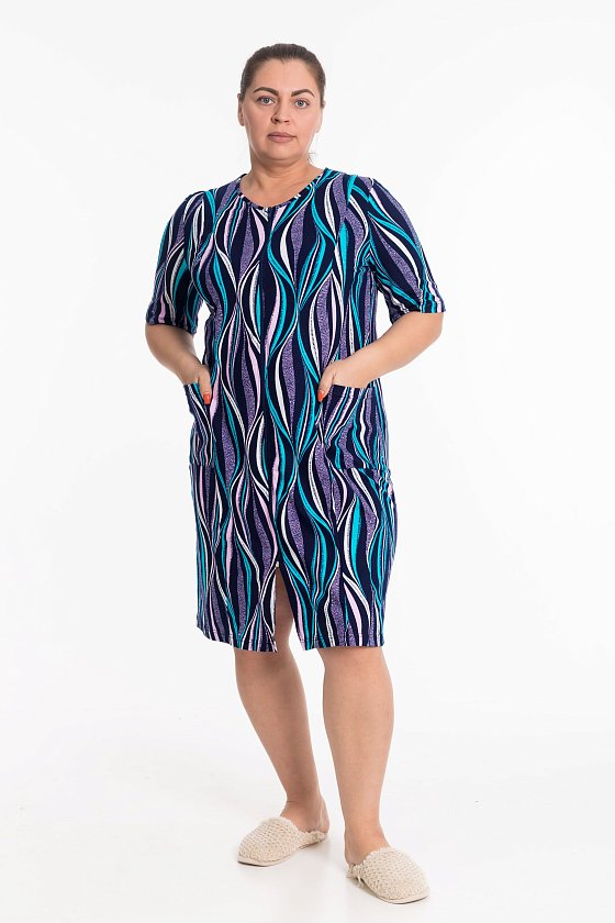 Женский халат — отличный выбор для домашнего отдыха. Он изготовлен из мягкого и комфортного хлопкового полотна с набивным рисунком, что придаёт изделию стильный вид. Халат застёгивается на молнию спереди, что обеспечивает удобство при надевании. Такой халат идеально подойдёт для повседневной носки дома.