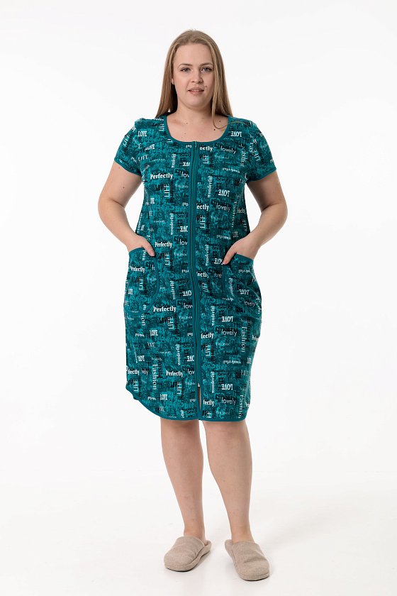 Халат выполнен из мягкого хлопка с набивным рисунком и станет комфортным вариантом для домашнего отдыха и повседневной носки. Модель с коротким втачным рукавом застёгивается на молнию, обеспечивая лёгкость и практичность при надевании. Спереди расположены накладные карманы, а аккуратная отделочная бейка по горловине, борту, низу изделия и рукавов придаёт халату аккуратный и завершённый вид.