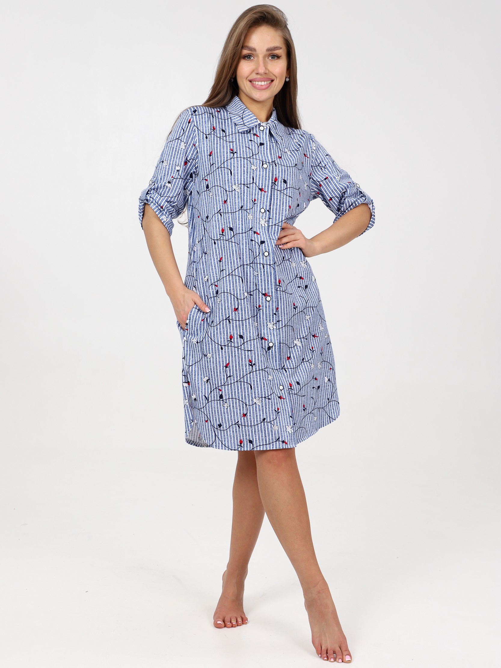 Халат рубашка дополнен карманами в боковом шве, рукавом три четверти с патой . Практичный и удобный халат средней длинны из трикотажа. Модель прямого силуэта на пуговицах. Благодаря свободному крою халат идеально будет сидеть на любой фигуре. Подарите себе легкость и удобство на каждый день! Рекомендована машинная стирка при 30-40 градусах. За счет свободного кроя подойдет для беременных женщин, подходит под категорию будущие мамы. Материал кулирка.