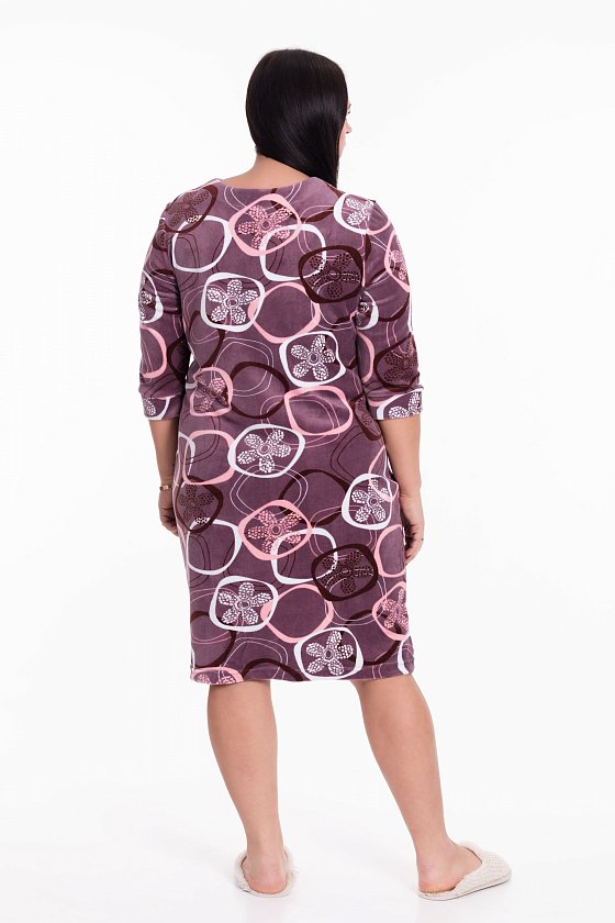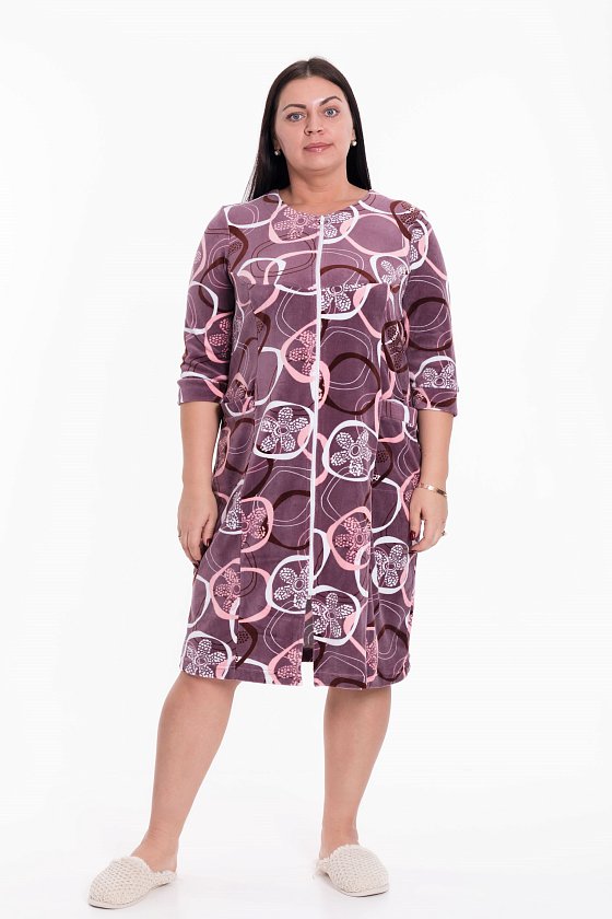 Халат выполнен из велюрового полотна. Застёжка на молнию, рукава длиной 3/4, в рельефах размещены карманы. Силуэт халата свободный.