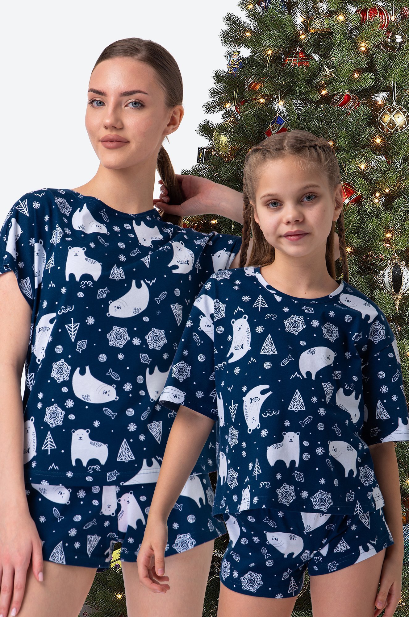 Пижама с новогодним принтом Мишки – отличный повод провести день дома! Уютная синяя пижама — идеальный вариант в качестве подарка на Новый год и Рождество.