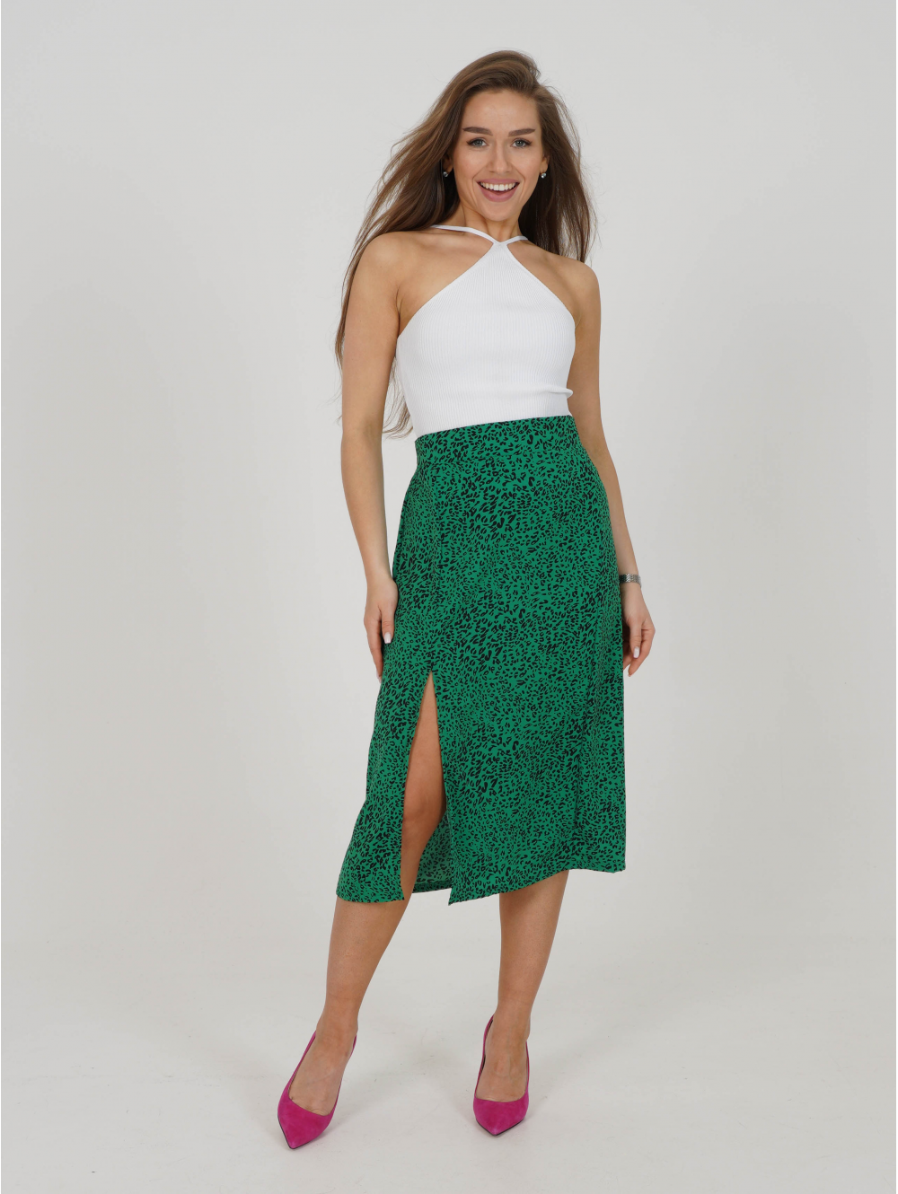 Средняя длина чуть ниже колена в сочетании с разрезом на бедре зрительно вытягивает и стройнит,