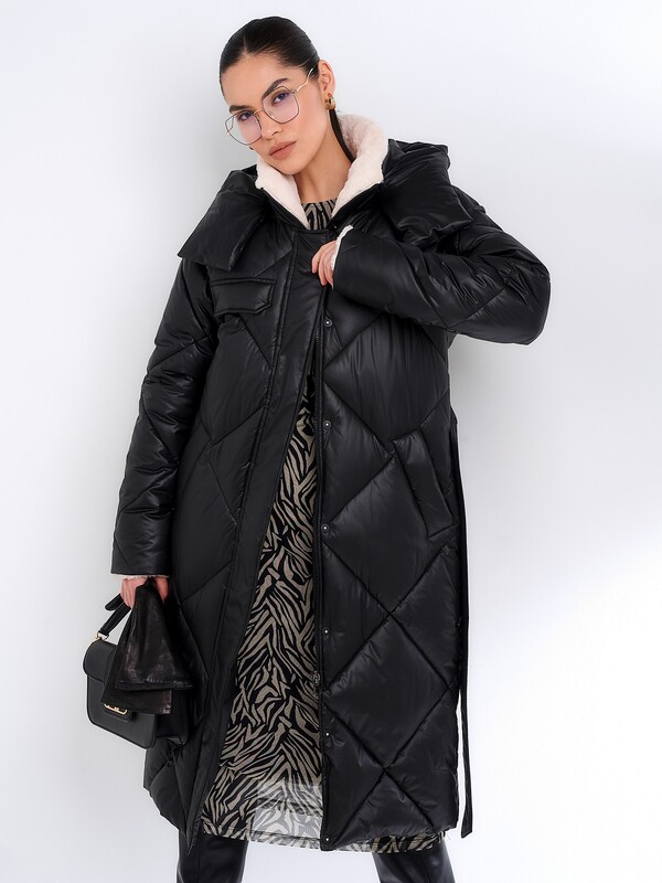 Детали: отстежной капюшон, воротник-стойка и обтачка рукава обработаны мехом,