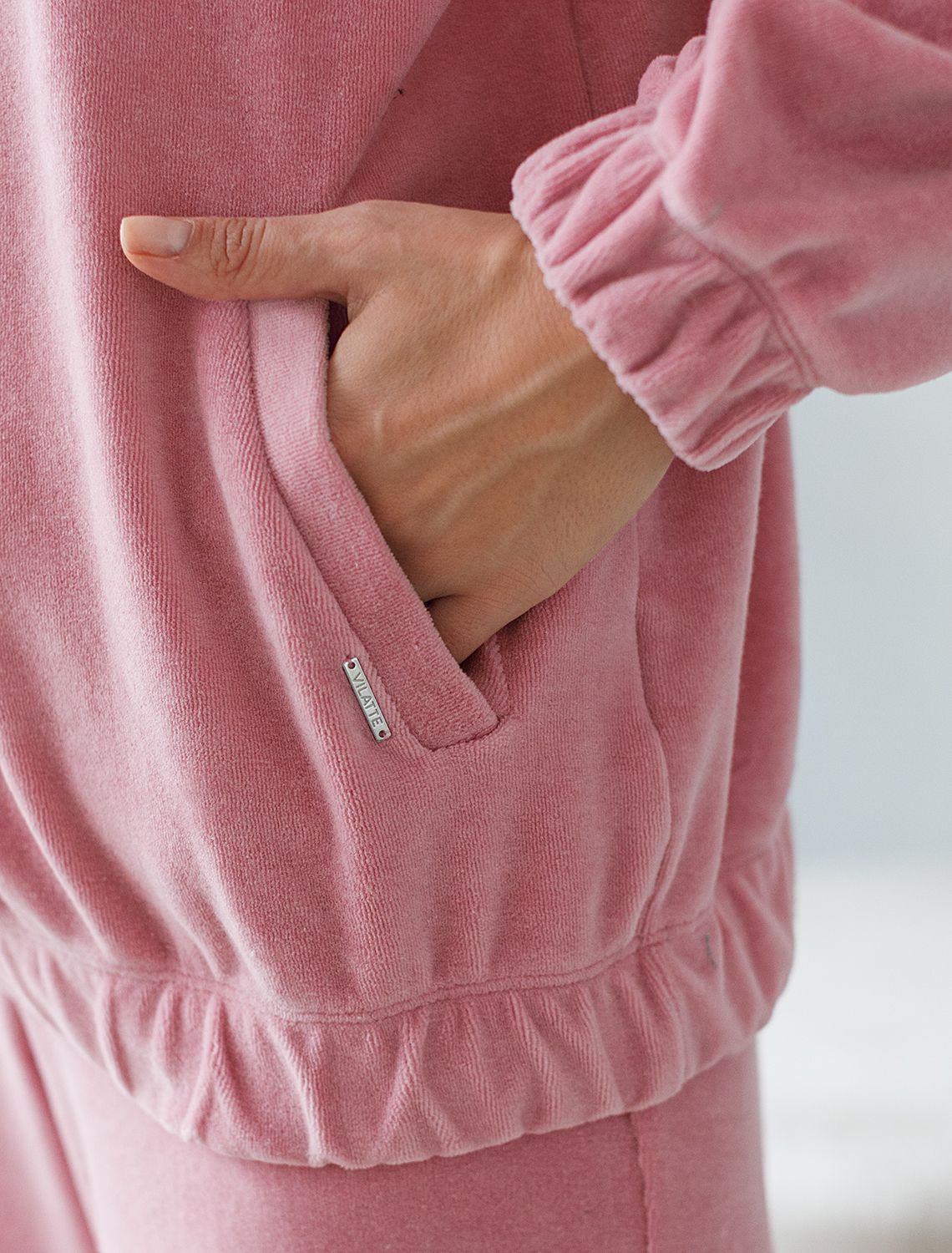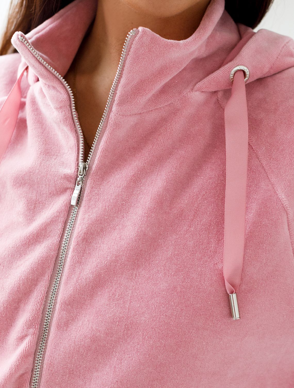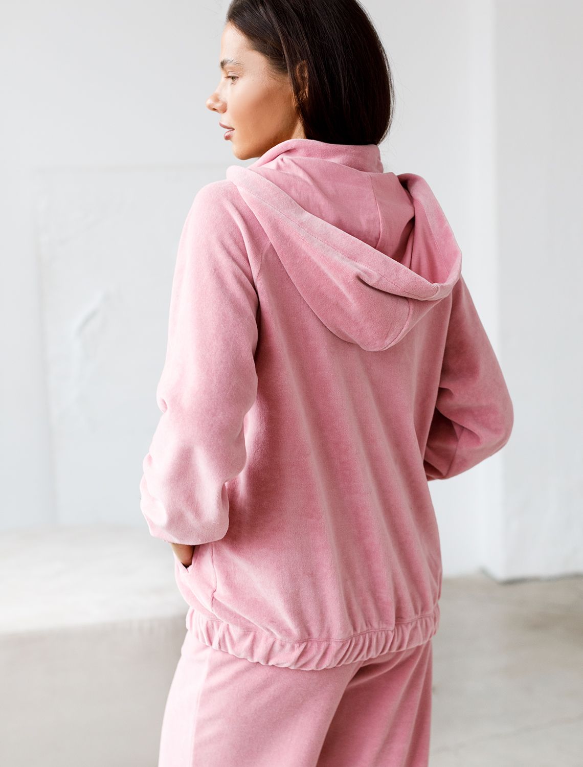 Худи на двухсторонней молнии выполнено из бархатистого велюра. Модель дополнена резинкой по низу и боковыми карманами. Легкий и мягкий материал с матовой фактурой придает изделию нежность и комфорт. Хорошо держит тепло и форму – идеальное решение для домашнего отдыха. Сочетается в костюме с брюками D44.117 пепельная роза