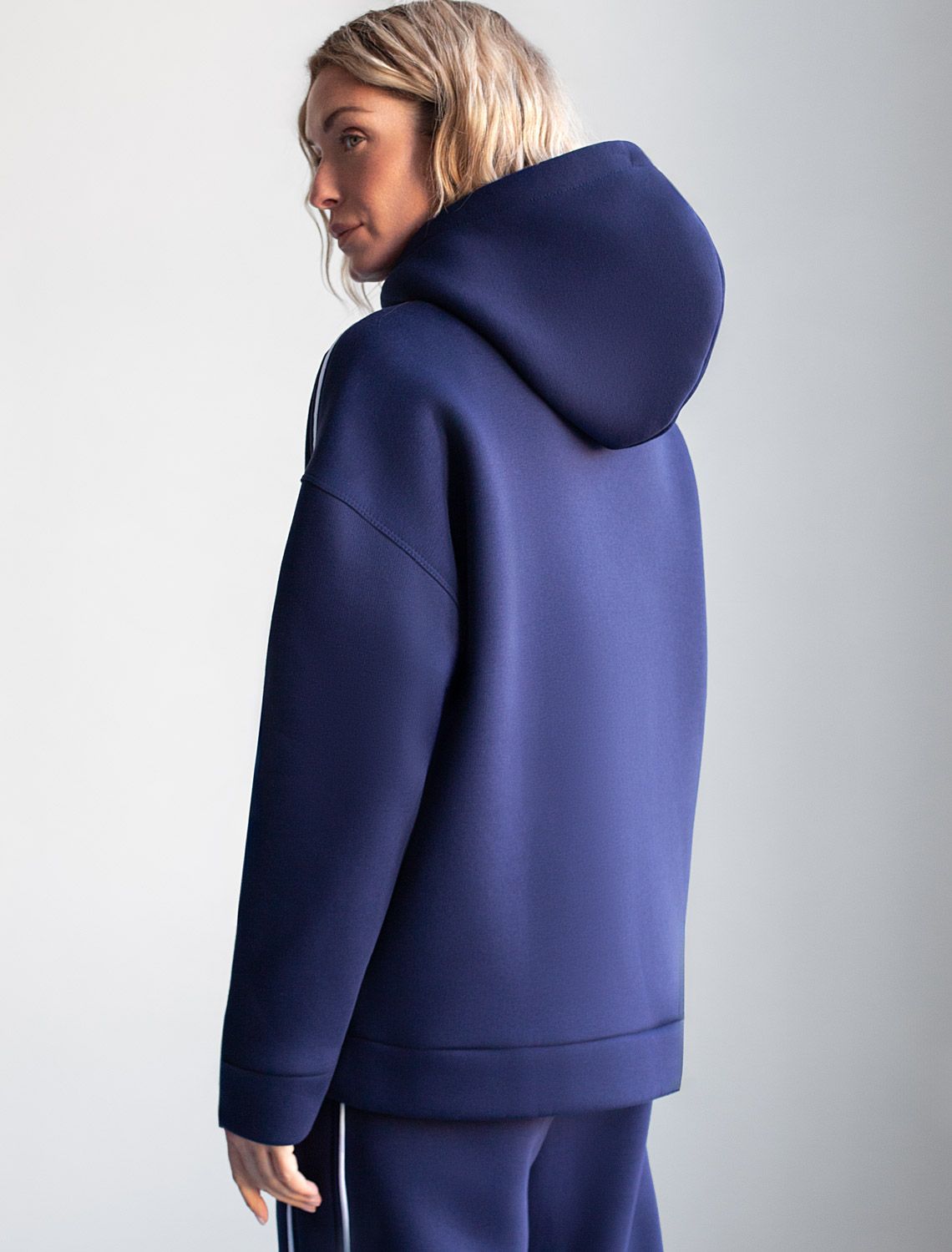 Уютное худи темно-синего цвета с цельнокроенным капюшоном и спущенной линией плеча создано для комфорта в холодную погоду. Модель выполнена из премиального футера трехнитки с мягким начесом, что обеспечивает дополнительное тепло и приятные ощущения при носке. Глубокий капюшон дополнен шнуром для регулировки объема, что обеспечивает отличную защиту от ветра и холода, а серебристая фурнитура добавляет стильный акцент к современному худи. Элементы дизайна — минималистичная вышивка с логотипом бренда и тонкие онтрастные лампасы — делают худи более выразительным без перегруженности деталями, сохраняя эстетичность и современный вид. Эластичные манжеты на рукавах обеспечивают дополнительную защиту от продувания, способствуя сохранению тепла внутри. Натуральный хлопок гарантирует дышащий эффект, позволяя сохранять оптимальный микроклимат тела даже при длительном ношении. Благодаря эластану в составе повседневное худи подходит для активного отдыха, вы будете чувствовать себя свободно в любой ситуации. Представлены большие размеры, что позволяет выбрать подходящий вариант для разных типов фигуры, обеспечивая комфортную посадку. Подойдет девушкам плюс сайз, в этом теплом джемпере вы будете чувствовать себя уверенно. Универсальный дизайн гармонично сочетается с повседневной одеждой — джинсами или спортивными штанами, вы можете составить комплект с брюками D44.158 и D44.159. Создайте расслабленный образ без лишних усилий с помощью этого стильного худи! Сочетается в костюме с брюками D44.159