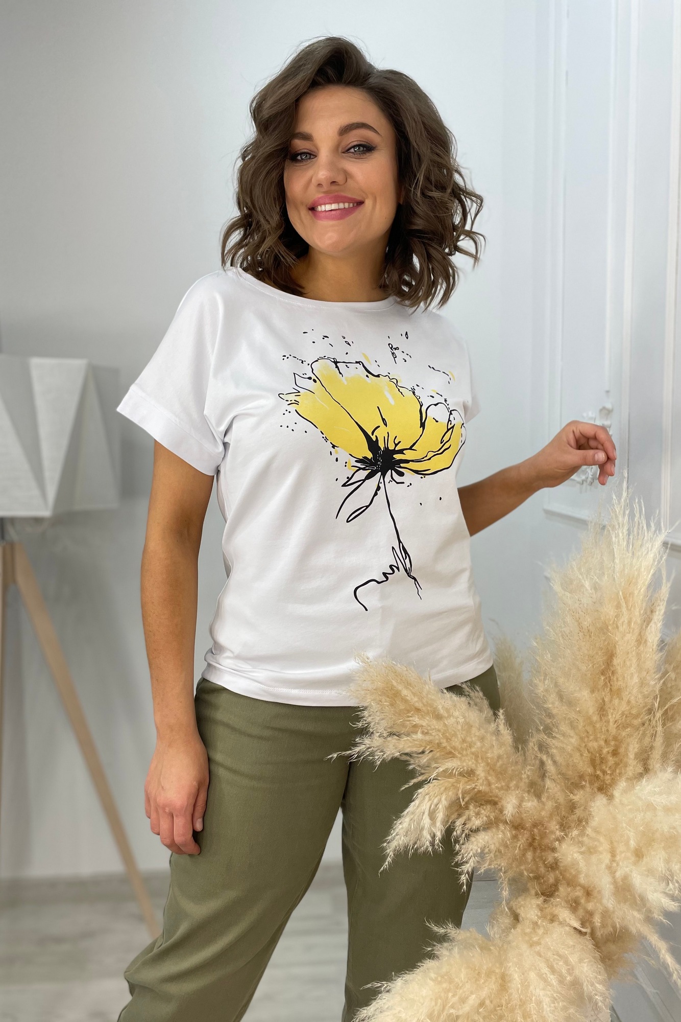 "Футболка из трикотажной хлопковой ткани, со спущенным плечом. Перед футболки с принтом. Вырез горловины круглый, оформлен бейкой. Спинка со средним швом.