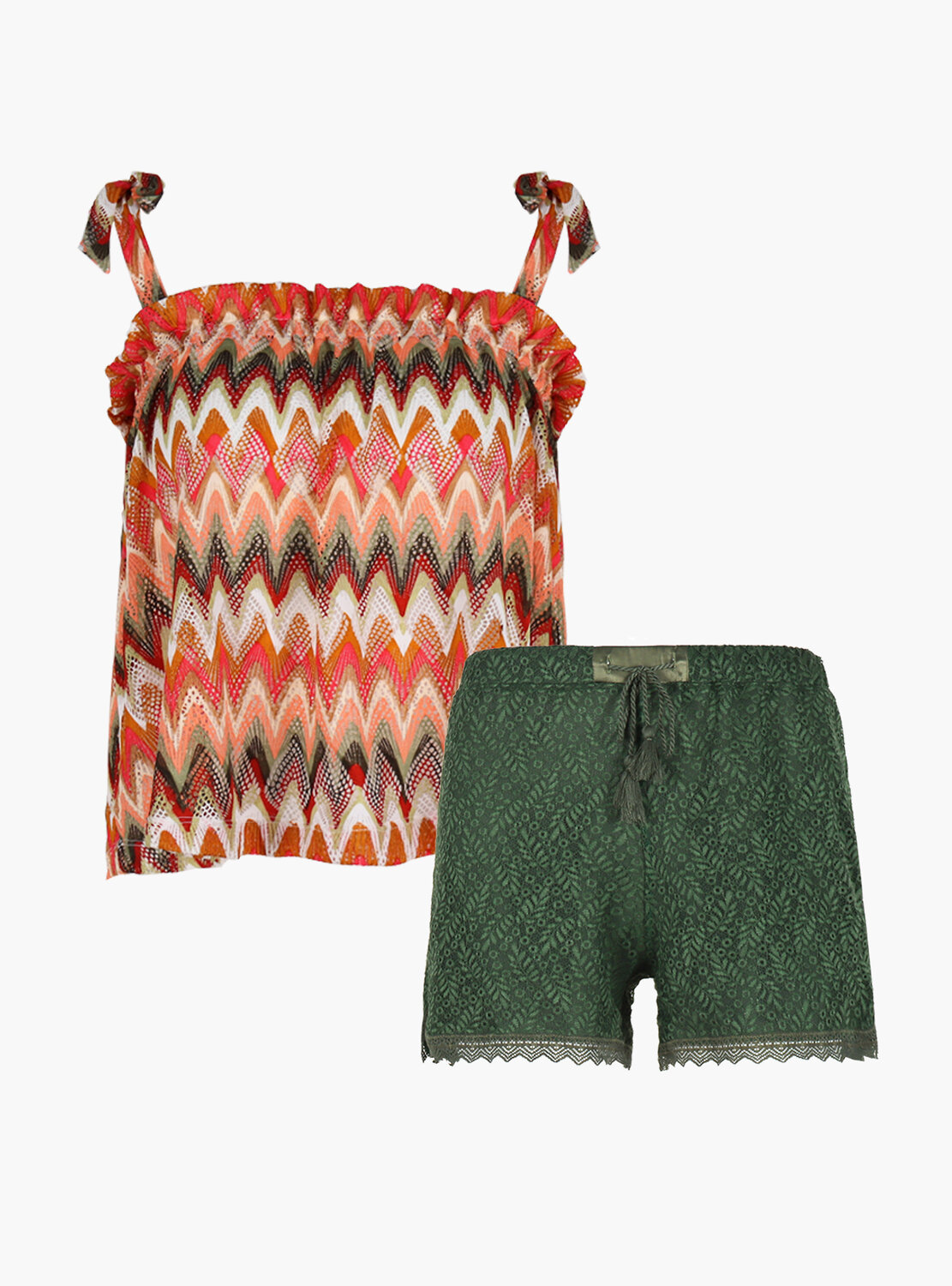 Пляжный костюм от торговой марки Индефини. В комплекте майка-топ с шортами. Майка выполнена из дышащей ткани, мультиколор с ярким принтом, на регулируемых бретелях, свободного кроя. Шорты выполнены из кружевной ткани, зеленого цвета, с обрамлением, на мягкой резинке с регулирующим поясом.