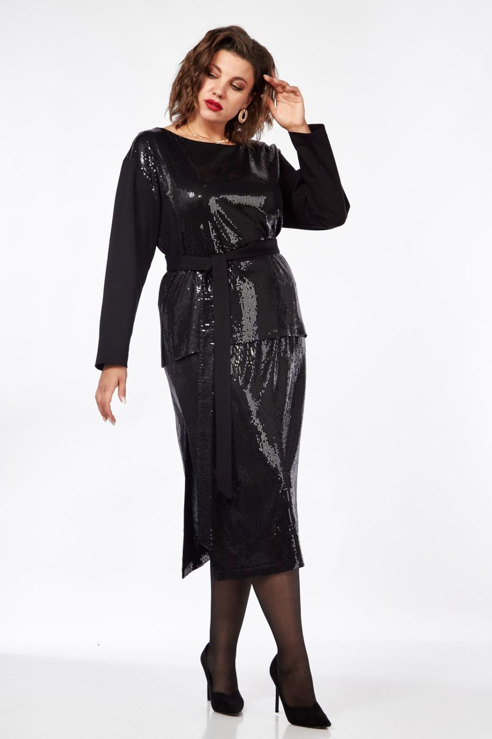 Джемпер прямого свободного силуэта, выполненный из трикотажного полотна и ткани с пайетками, со спущенной линией плеча, вырез горловины «лодочка», по боковым швам – разрезы, высотой 11см. Рукава втачные, прямые. Перед джемпера из ткани в пайетки. Спинка джемпера из трикотажного полотна. В комплекте идет пояс – двухсторонний – одна сторона из ткани с пайетками, другая из трикотажного полотна. Длина рукава - 55см, ширина плеча - 13см, ширина рукава по низу – 14,5 см, длина изделия - 67см