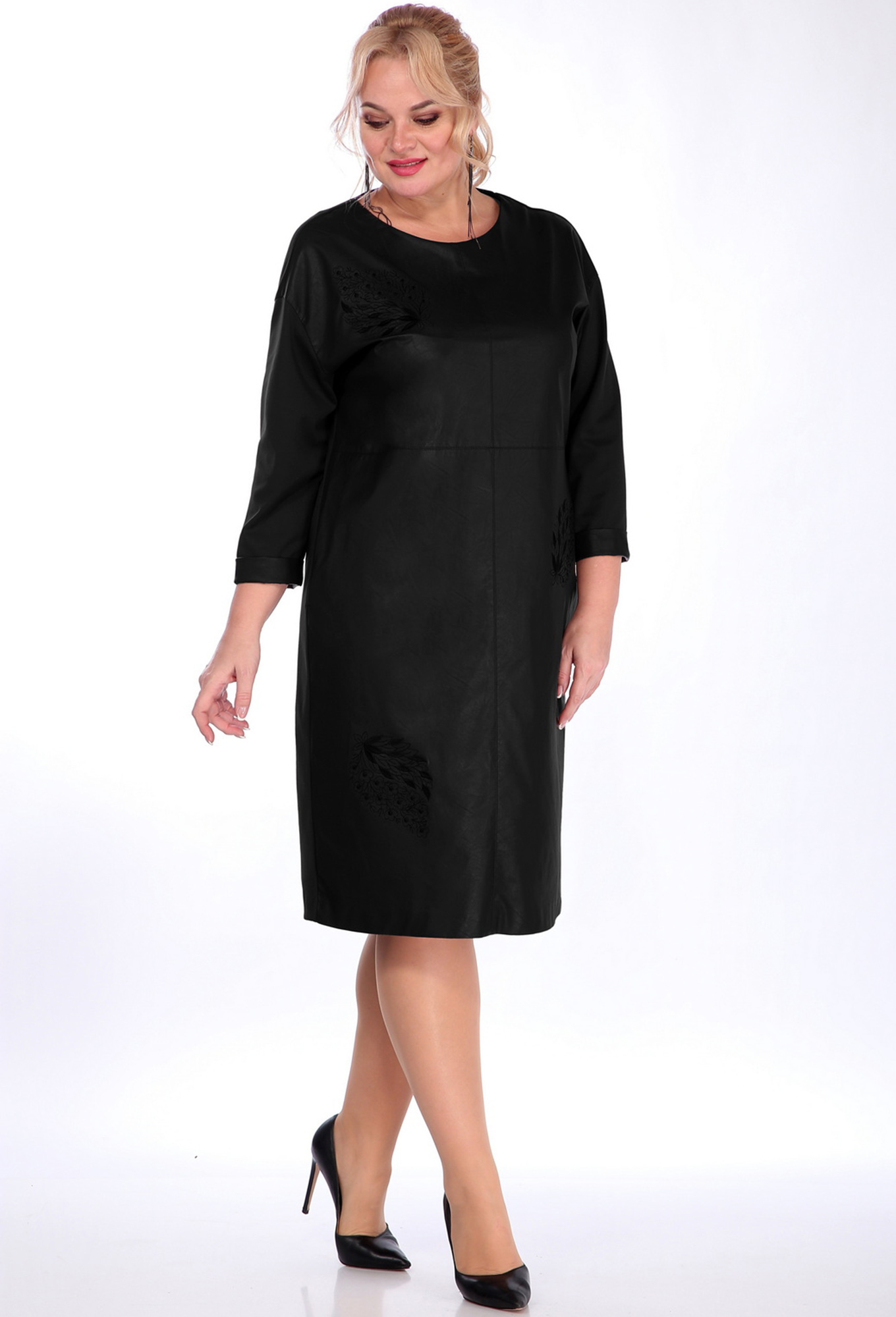 Платье женское свободного силуэта изготовлено путем комбинирования тканей двух видов — трикотажного полотна и эко-кожа на вискозной основе. Горловина круглой формы обработана обтачкой. Перед разрезной, дополнен элементами вышивки. Спинка со средним швом и разрезом. В боковых швах расположены карманы. Рукав спущенный, на манжете, длина 7/8.