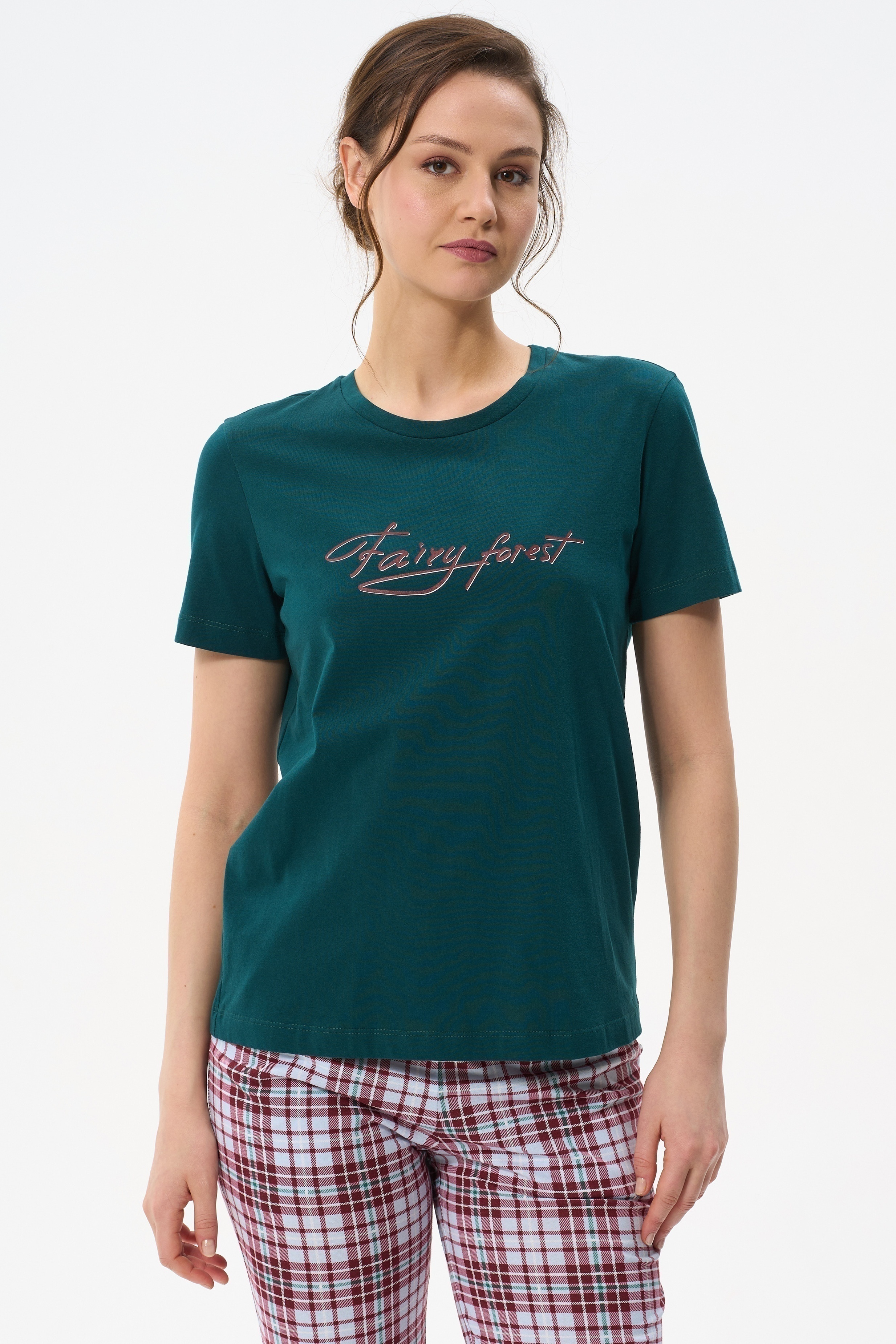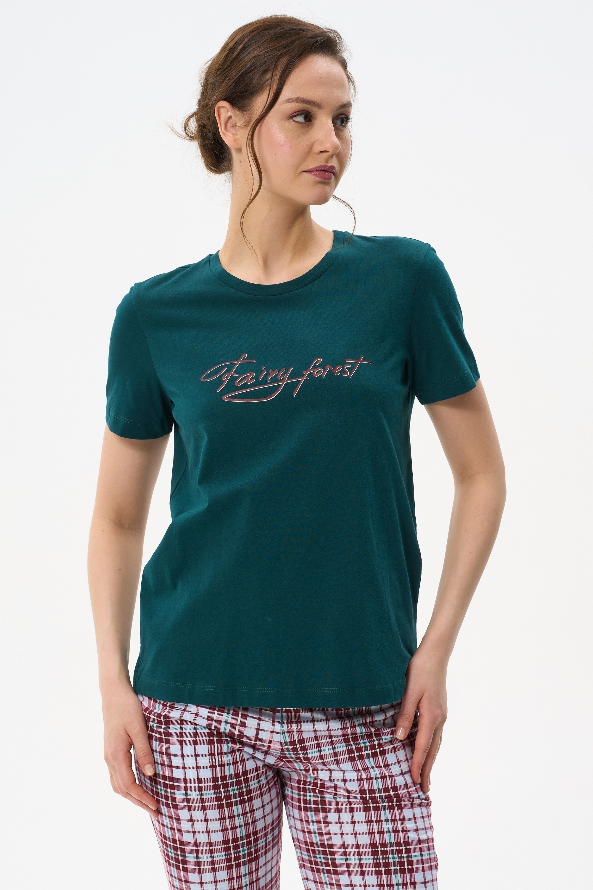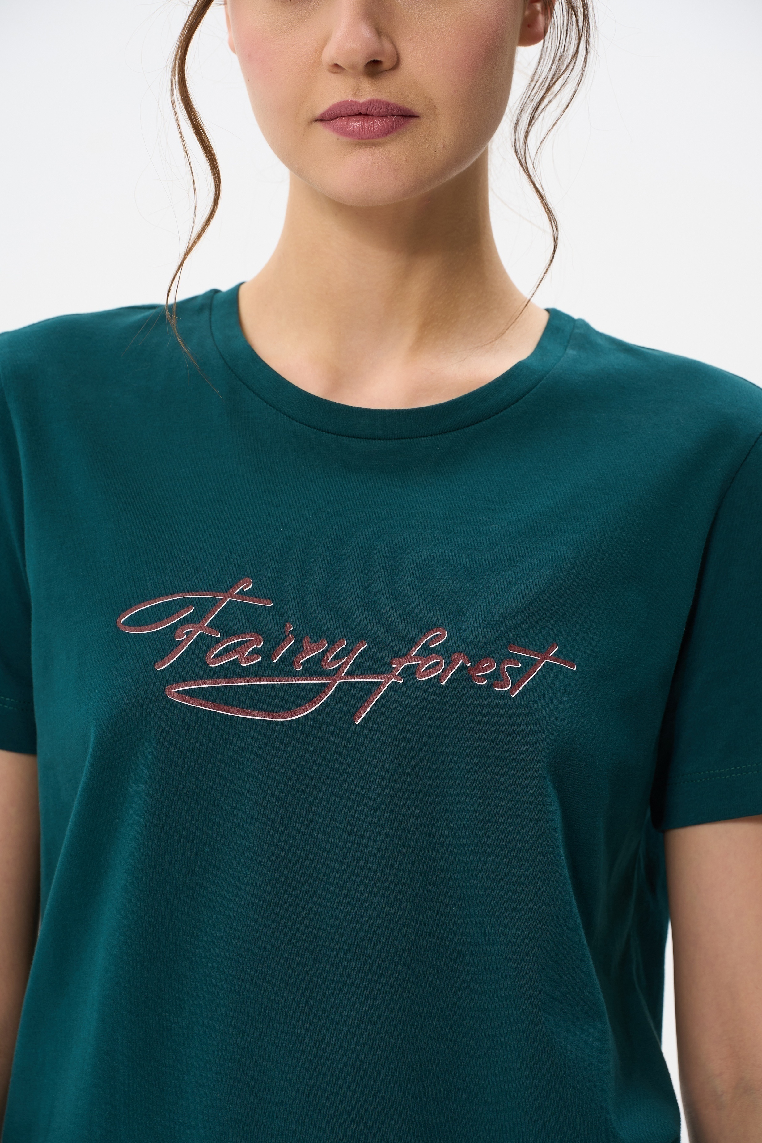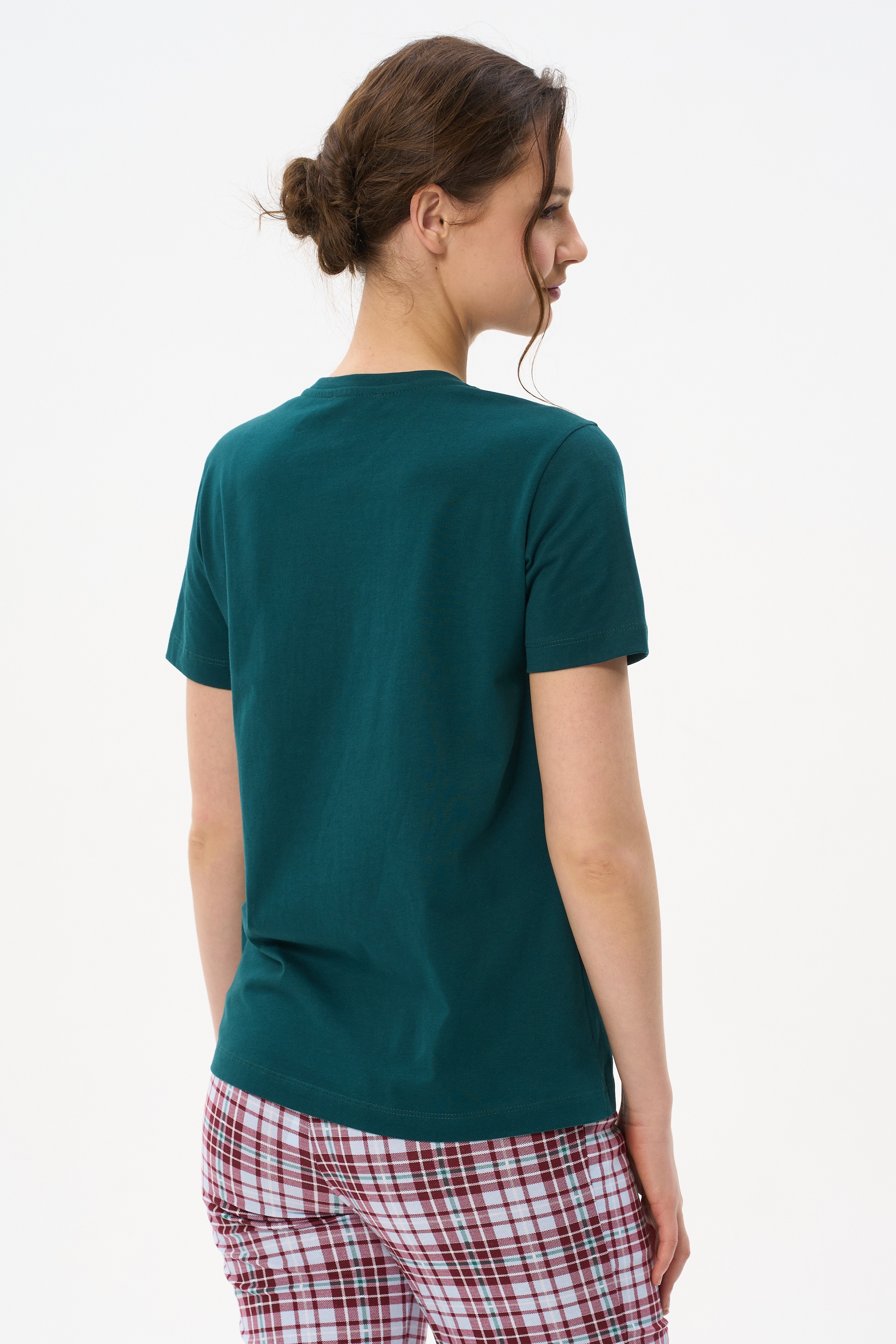 100% хлопок Футболка с принтом из трикотажного хлопкового полотна качества ПЕ. Круглый вырез горловины, втачные короткие рукава. Рост модели на фото 178 см.