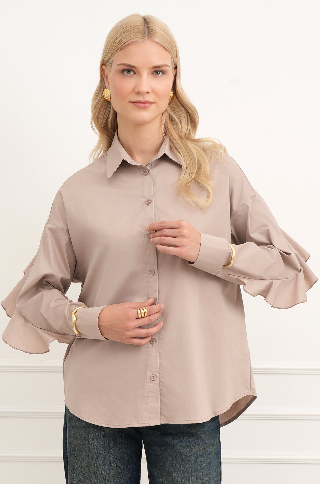 Светло-коричневая женская рубашка овер..показатьсайз создана для романтичных и смелых образов. Нарядная рубашка с воланами добавляет воздушности и выделяет из толпы.