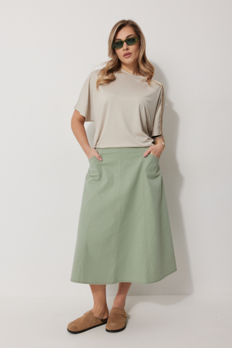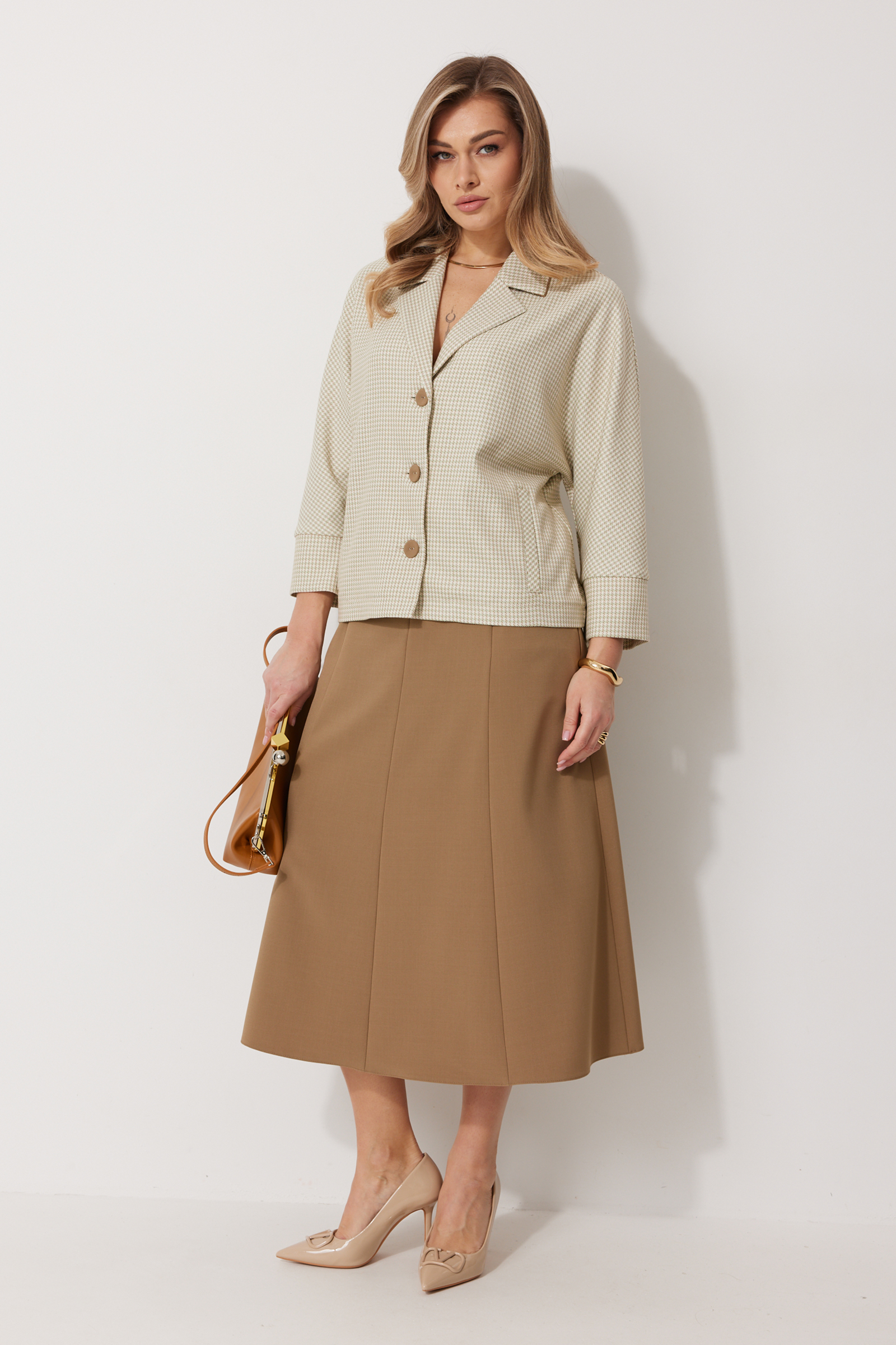 2269 Костюм женский 46-60 58 69% ПЭ, 27 % вискоза, 4% спандекс Костюм женский, состоящий из жакета и юбки. Жакет без подкладки, кроя «летучая мышь», с центральной однобортной застежкой на петли и контрастные пуговицы. По переду обработаны вертикальные прорезные карманы с листочкой. Спинка цельнокроеная. Горловина V-образной формы, обработана воротником пиджачного типа с контрастным кантом. Рукав 7/8, по низу обработан широкой притачной манжетой. Юбка женская А – силуэта длиной до середины икры. Перед юбки состоит из 4 клиньев. Вверху передней части юбки располагается карман с отрезным бочком. Спинка юбки состоит из 4 клиньев. По среднему шву юбки находится застежка – молния. Верхний срез юбки обработан обтачкой. Длина спинки жакета 60 см, длина рукава 66 см, длина юбки по боковому шву 82 см. 46-60
