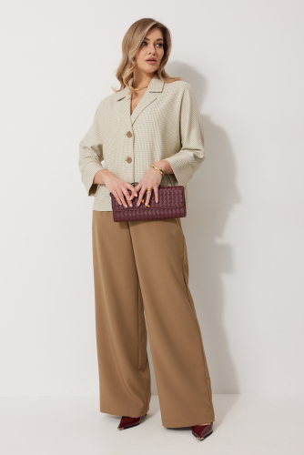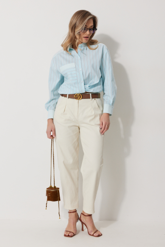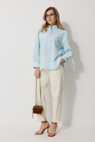 2273 блузка 46-54 39 72% хлопок 26% ПЭ 2% эластан Блузка женская прямого силуэта. Полочки из ткани в полоску. На правой полочке настрочен накладной карман с комбинацией тканей. Перед обработан цельнокроеными планками с центральной застежкой на петли и пуговицы. Спинка из ткани в полоски с кокеткой из ткани компаньона. По верхней части спинки заложена бантовая складка. Плечо спущено. Рукав длинный, двухшовный. Одна часть рукава из ткани в полоску, другая из ткани компаньона. Рукав по низу со складкой, обработан широкой притачной манжетой застегивающейся на петли и пуговицы. Разрез рукава обработан притачными отрезными планками. Манжета и притачные планки из ткани компаньона. Низ разноуровневый, закругленной формы. Горловина обработана воротником рубашечного типа с отрезной стойкой из ткани компаньона. Длина спинки изделия 77 см, длина руква от горловины 74 см. 46-54