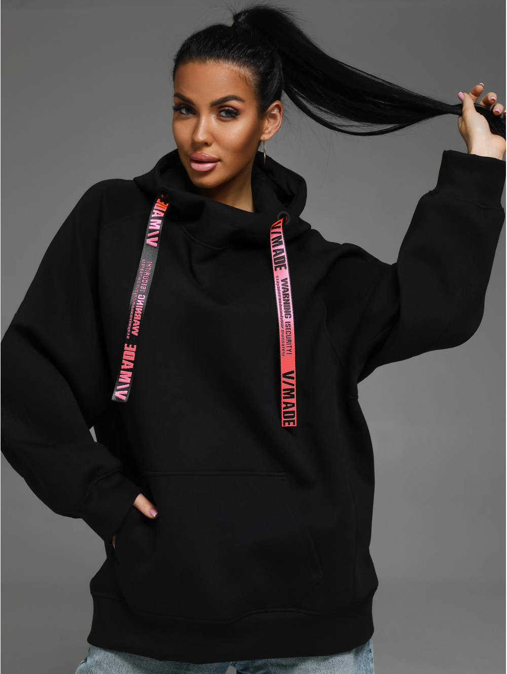 Худи – oversize кроя с капюшоном, с притачным поясом по низу, с длинным рукавом реглан на манжете.