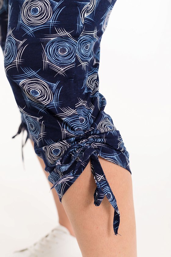 Капри женские выполнены из однотонной хлопковой ткани. Пояс на резине, спереди расположены карманы, по бокам внизу затягиваются при помощи шнурка.