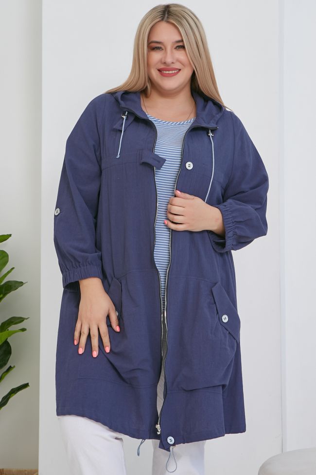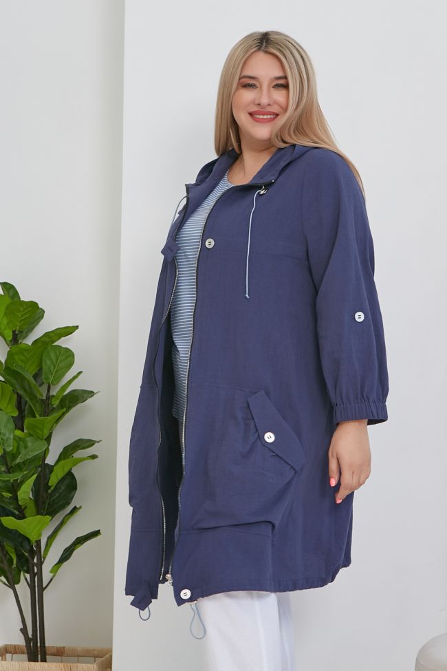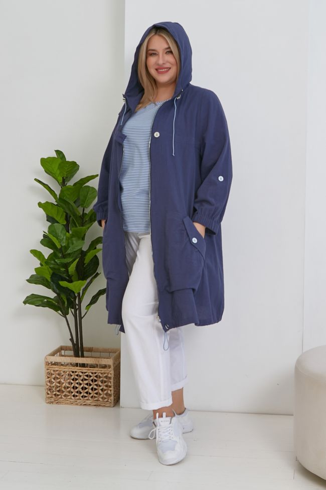 синий Стильная парка трапециевидного силуэта из хлопковой однотонной ткани без подклада. Круглый вырез горловины дополнен шлемовидным капюшоном со шнуром и фиксаторами.  По переду - центральная застежка на тесьму-молнию с дополнением в виде пат сверху, снизу и на уровне груди. Длинные втачные рукава, с широкой резиной по низу и патой. Модель с большими, двойными накладными карманами, удобно расположенными ниже линии бедер. Вход в карман оформлен небольшой сборкой и клапаном с пуговицей. По переду над грудью и по спинке, на уровне лопаток - прилегание за счет кулиски на широкой резинке. Спинка со швом по центру, оканчивающимся патой и разрезом. Низ асимметричный дополнен шнуром и фиксаторами.