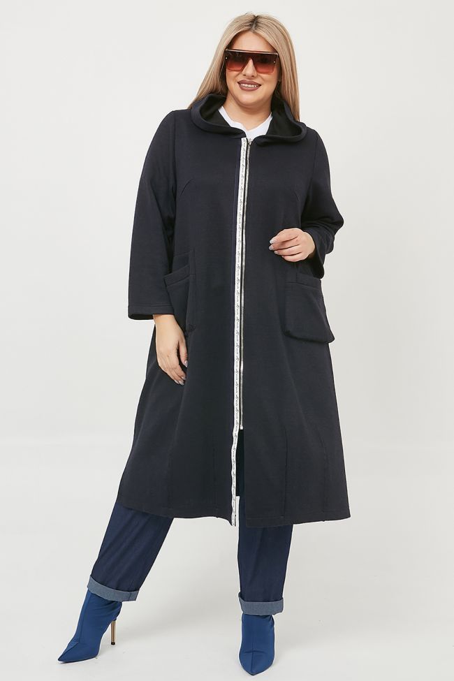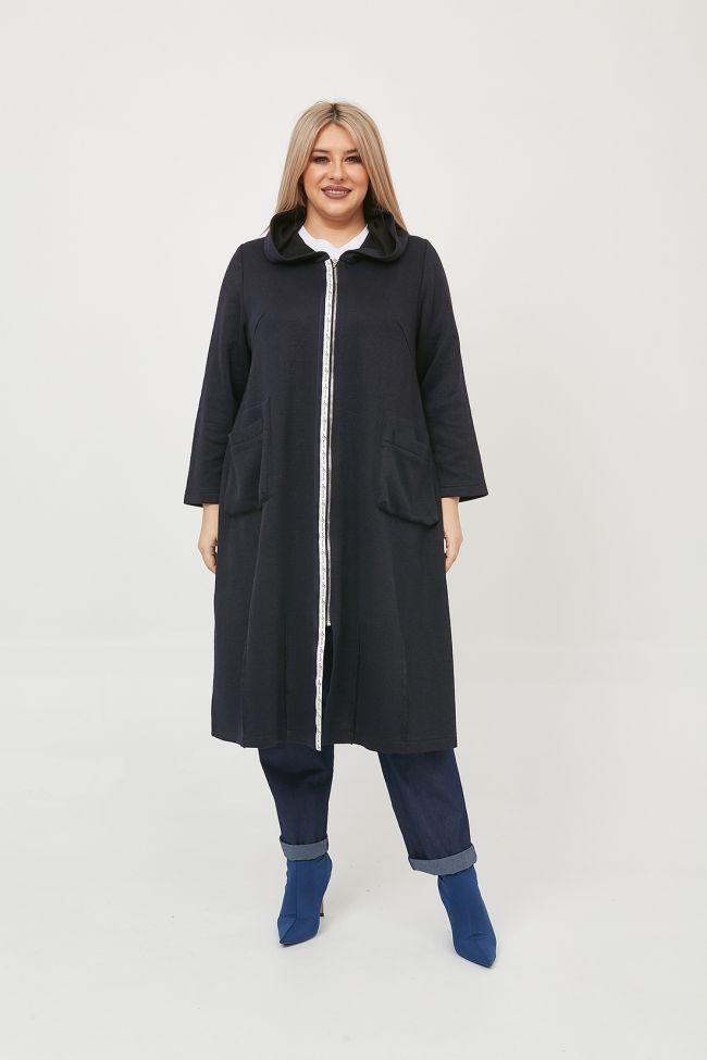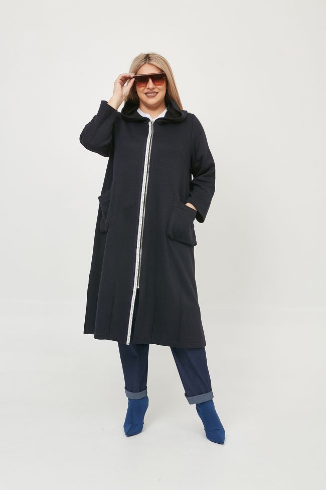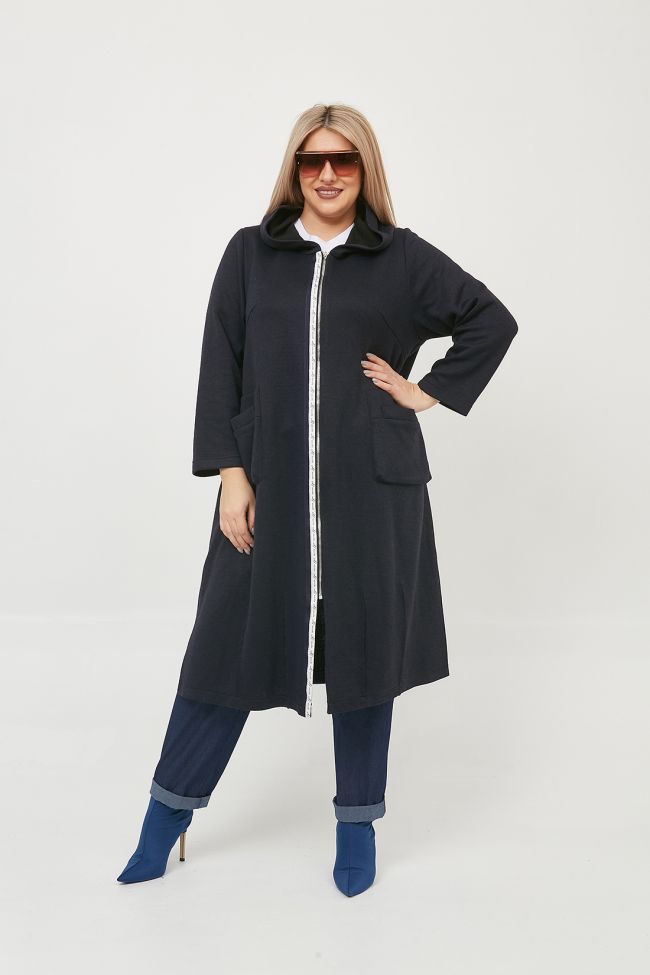 синий Стильный кардиган А –образного силуэта, длиной за линию колен. Модель выполнена из качественного трикотажа. Перед с центральной молнией, в качестве отделки по бравому борту и центру спинки –отделочная контрастная тесьма. Прилегание по груди за счет вытачек.  По линии бедер оригинальные, объёмные накладные карманы. Круглый вырез горловины оформлен капюшоном. Рукава втачные длинные. Низ изделия дополнен вытачками для придания небольшого объёма. По бокам высокие разрезы. Кардиган станет отличным дополнением вашего гардероба в прохладное время года.