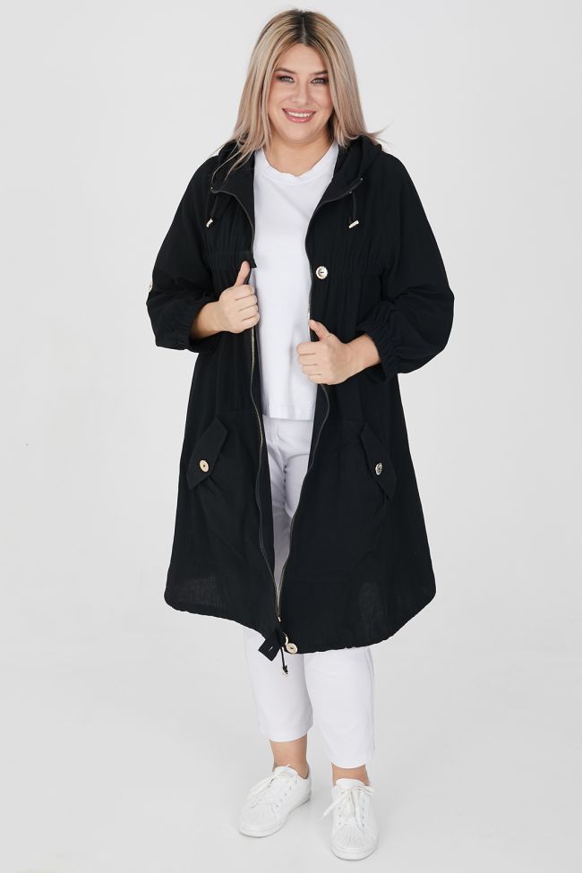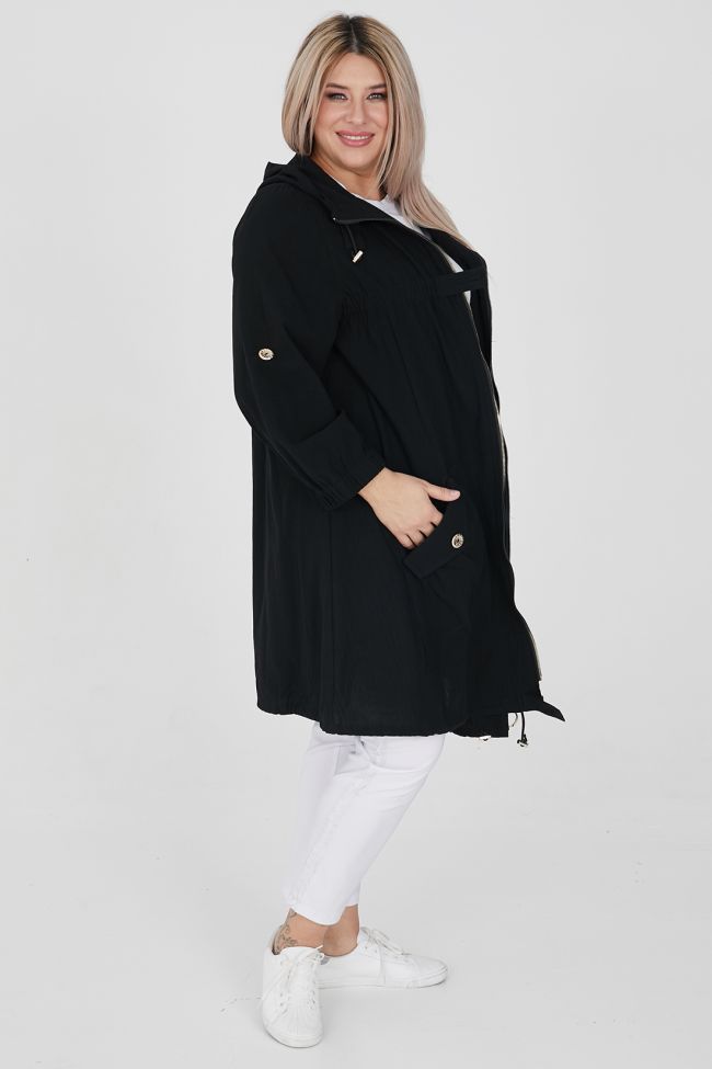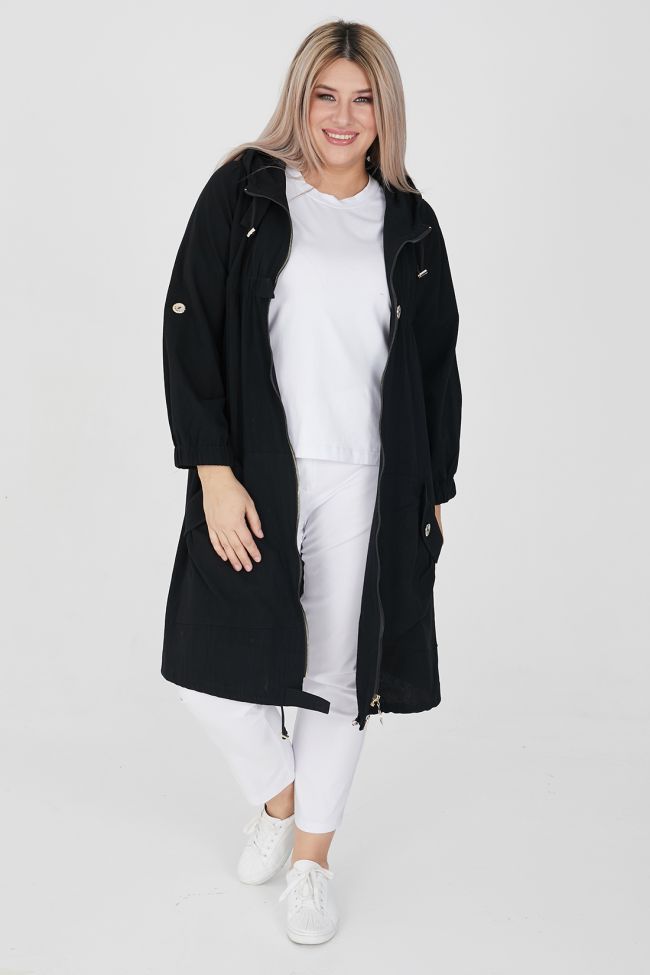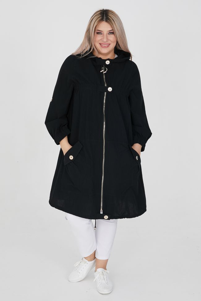 черный Стильный пыльник трапециевидного силуэта из хлопковой однотонной ткани без подклада. Круглый вырез горловины дополнен шлемовидным капюшоном со шнуром и фиксаторами.  По переду - центральная застежка на тесьму-молнию с дополнением в виде пат сверху, снизу и на уровне груди. Длинные втачные рукава, с широкой резиной по низу и патой. Модель с большими, двойными накладными карманами, удобно расположенными ниже линии бедер. Вход в карман оформлен небольшой сборкой и клапаном с пуговицей. По переду над грудью и по спинке, на уровне лопаток - прилегание за счет кулиски на широкой резинке. Спинка со швом по центру, оканчивающимся патой и разрезом. Низ асимметричный дополнен шнуром и фиксаторами.