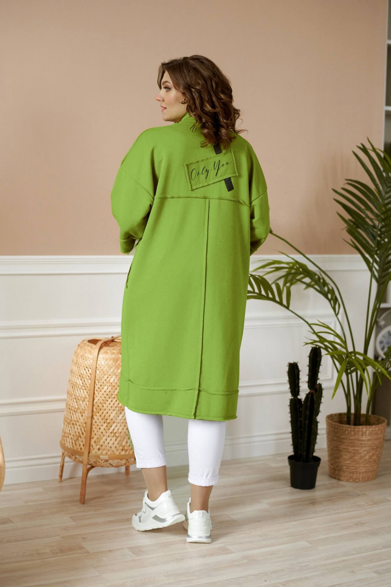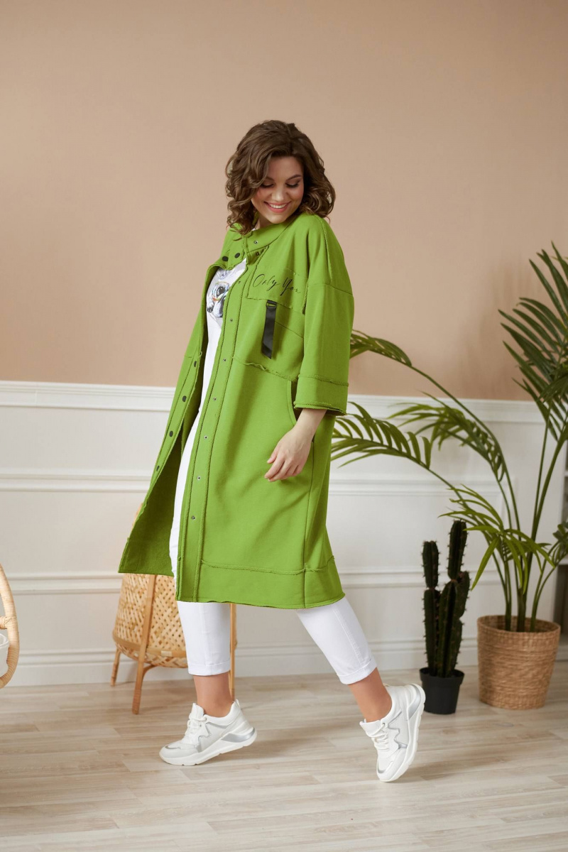 "Кардиган женский прямого силуэта из трикотажной облегченной ткани (двунитка-футер). На полочке и спинке расположены декоративные, необработанные швы. В верхней и нижней части переда есть настрочные элементы с печатью и тесьмой. По переду изделия карманы. Спинка со средним швом и кокеткой. На кокетке расположен элемент с печатью и тесьмой. Рукав спущенный с манжетой. Вырез горловины оформлен стойкой. По переду изделия планка с кнопками.