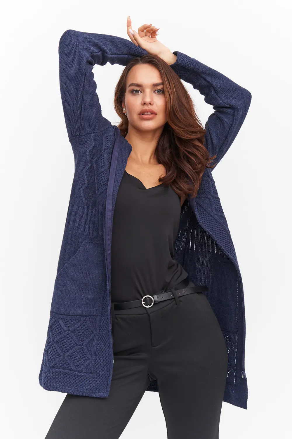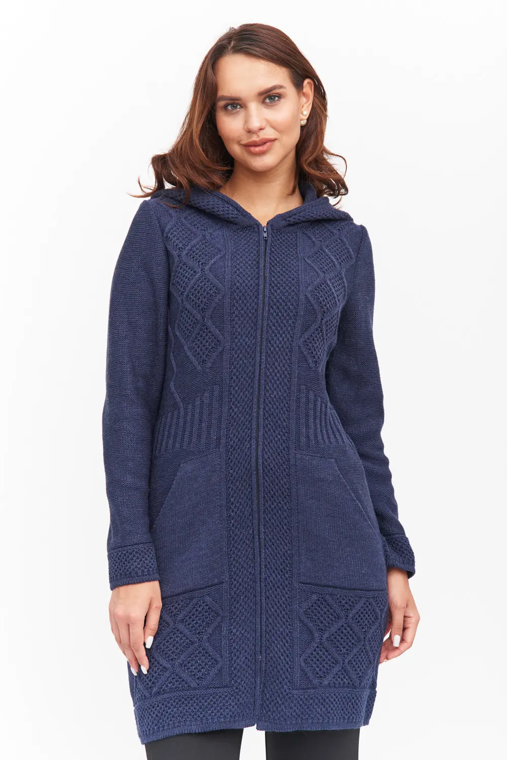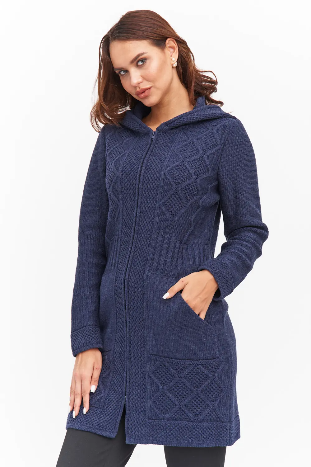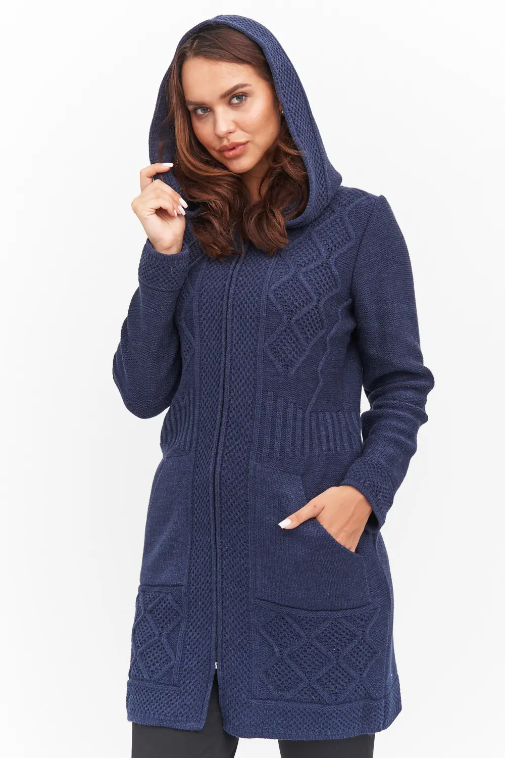 Кардиган женский с капюшоном полуприлегающего силуэта на молнии.  Рукава втачные длинные. По бокам вывязаные карманы "кенгуру". Кардиган выполнен рельефным переплетением. джинс