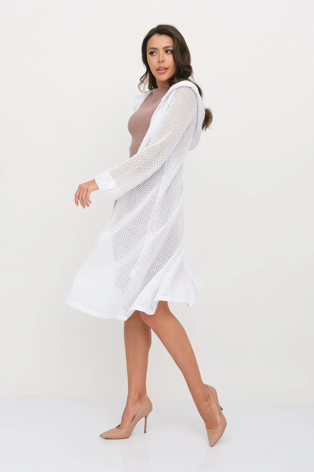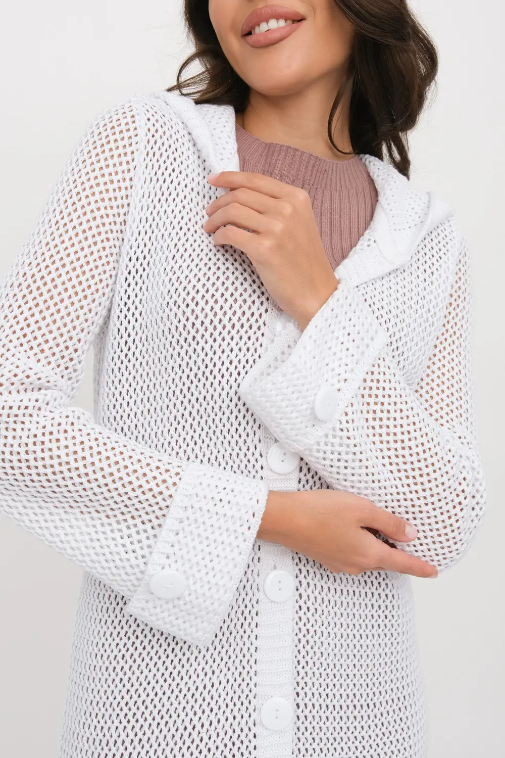 Женский вязаный ажурный кардиган с капюшоном на пуговицах с длинным рукавом. Летняя накидка выполнена из высококачественной пряжи с составом 50% хлопок 50% ПАН. Кардиган свободно сидит на фигуре,  имеет округлую горловину, что придаёт модели выраженную женственность.  Стильный, однотонный, ажурный кардиган станет незаменимой вещью в Вашем гардеробе в солнечную погоду летом или дополнит вечерний образ для выхода на различные мероприятия.