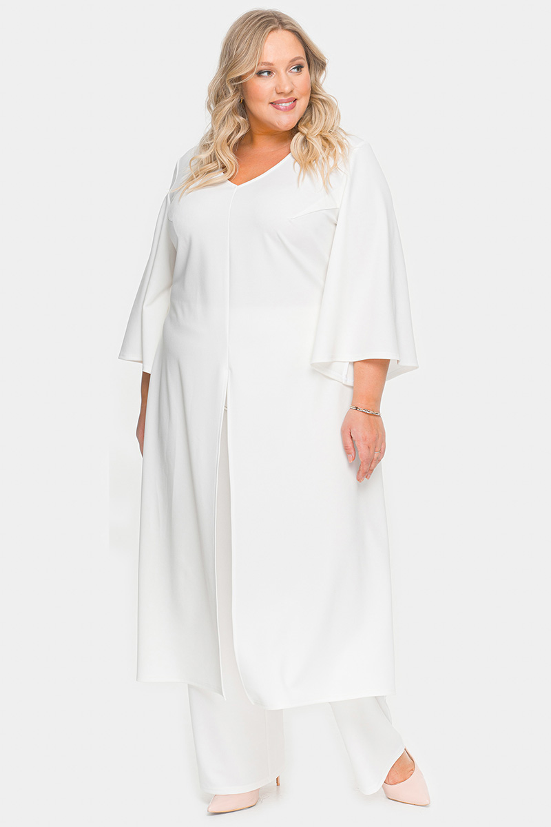 Удлиненный кардиган А-силуэта из крепа с эластаном. V-вырез горловины переда. По центральному шву переда разрез. Рукав расклешенный.