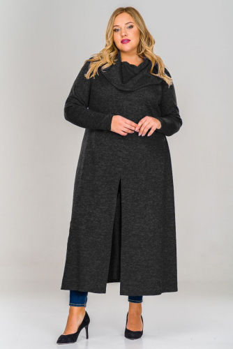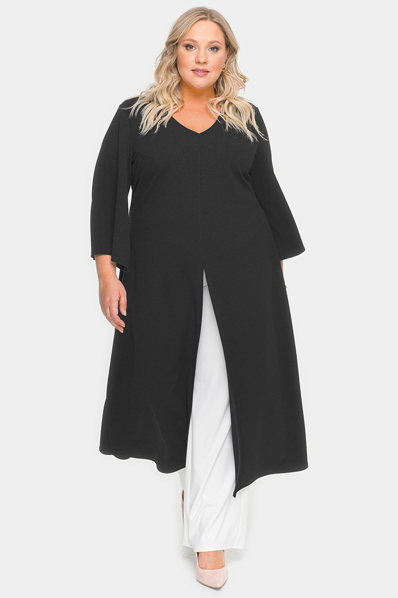 Удлиненный кардиган А-силуэта из крепа с эластаном. V-вырез горловины переда. По центральному шву переда разрез. Рукав расклешенный.