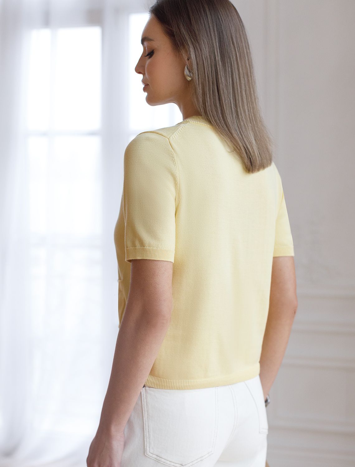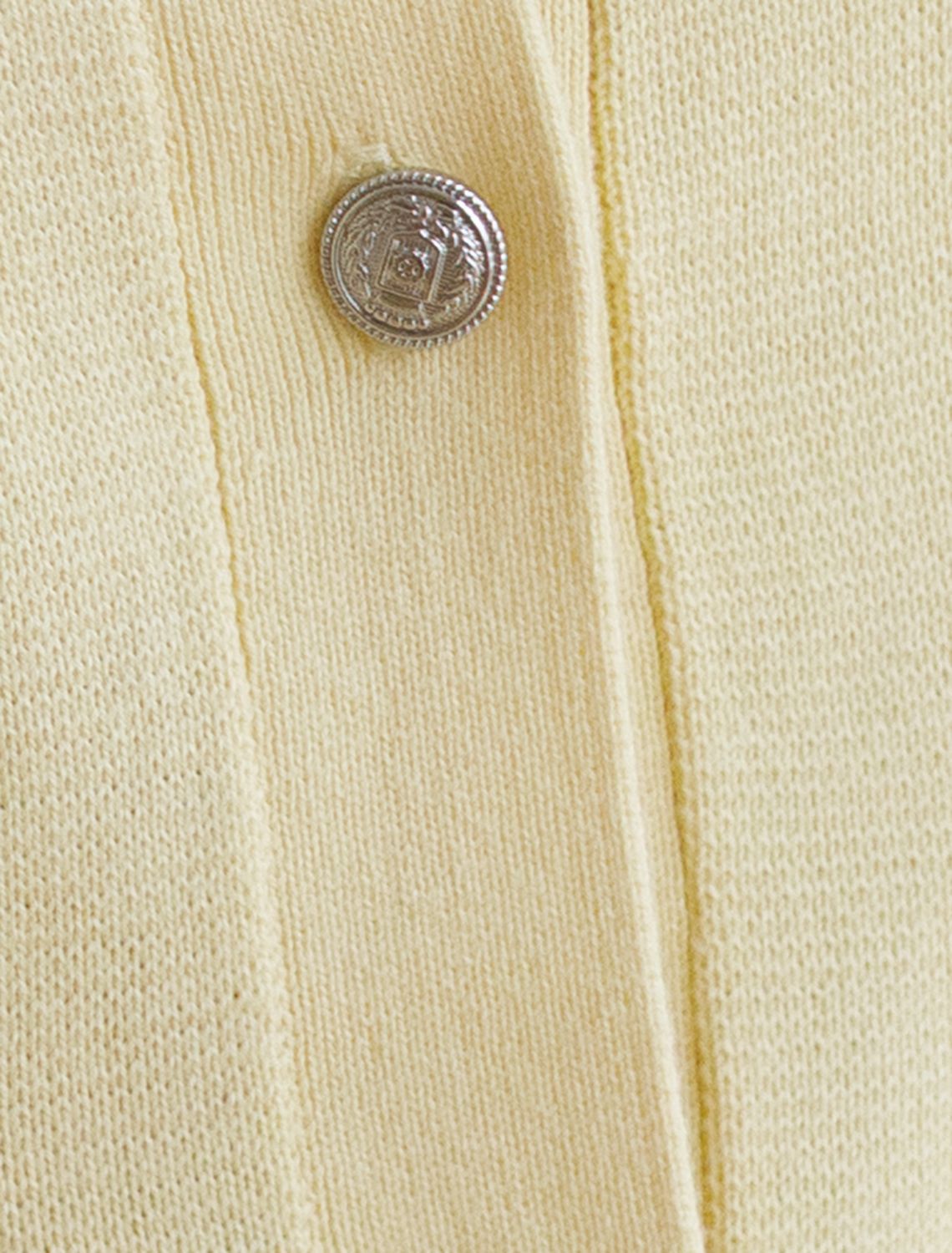 Вязаный кардиган светло-желтого цвета из хлопка с коротким рукавом — отличный выбор для весны и лета. Его женственный крой подчеркивает фигуру, а полуприлегающий силуэт создает аккуратный и стильный образ. Укороченный фасон гармонично сочетается с различными вариантами одежды, позволяя создавать как повседневные в стиле old money, так и более нарядные комплекты. Модель выполнена на пуговицах, что добавляет удобства при носке и делает жакет практичным для разных случаев.
