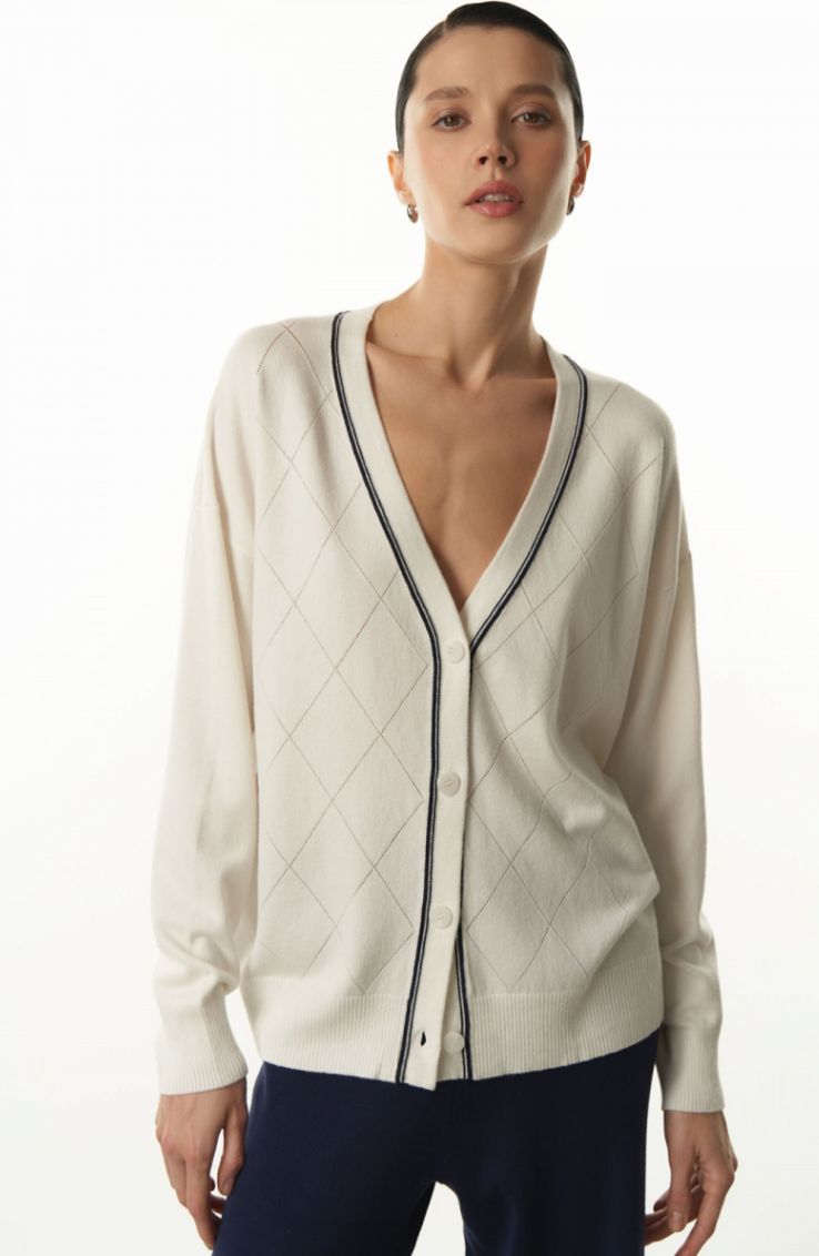 Кардиган свободного кроя – стильный и расслабленный. Выполнен из мягкого приятного телу смесового трикотажа на основе вискозы. Глубокий V-образный вырез и спущенная линия плеча. Манжеты и низ декорированы фактурной резинкой в тон. Полочки и спинка оформлены воздушным ромбовидным ажурным декором. По краю изделия – контрастная окантовка, подчеркивающая линию декольте. Кардиган застегивается на матовые пуговицы в тон. Рекомендуем сочетать с юбками или брюками/джинсами, особенно эффектно изделие смотрится в заправленном виде. Доступные варианты расцветок: молочно-синяя и серо-синяя.