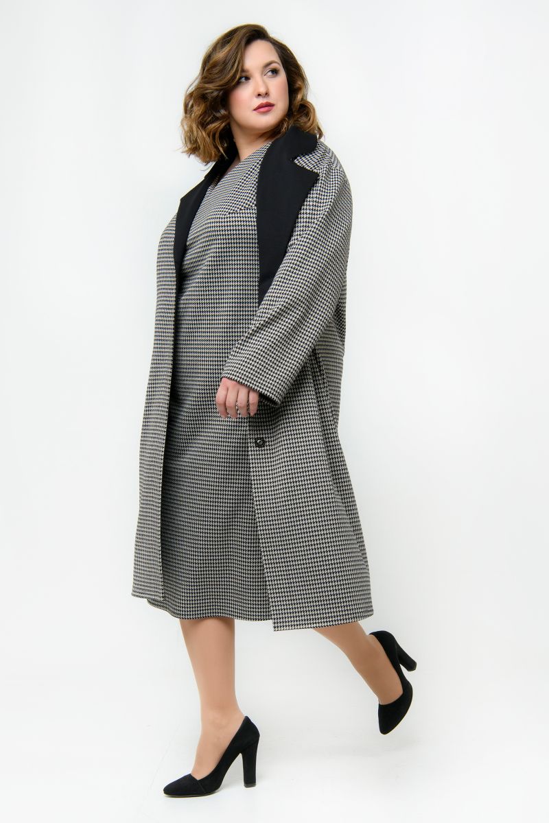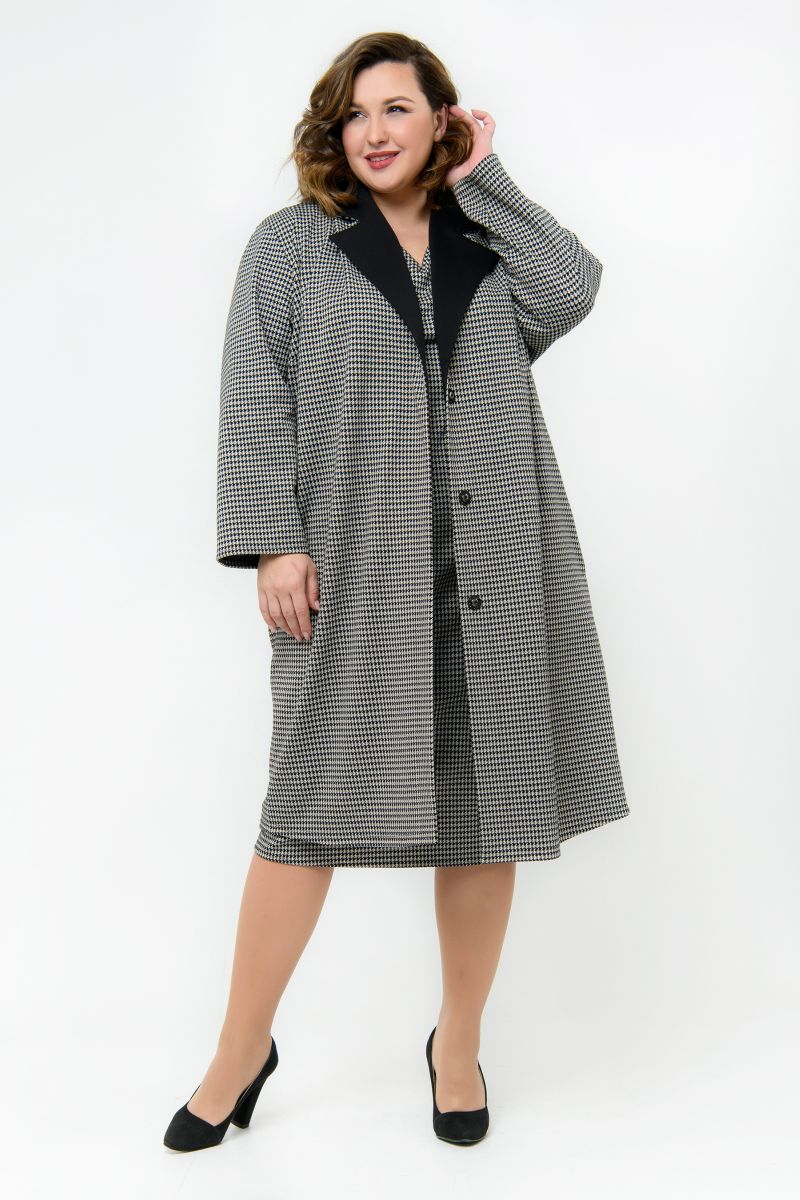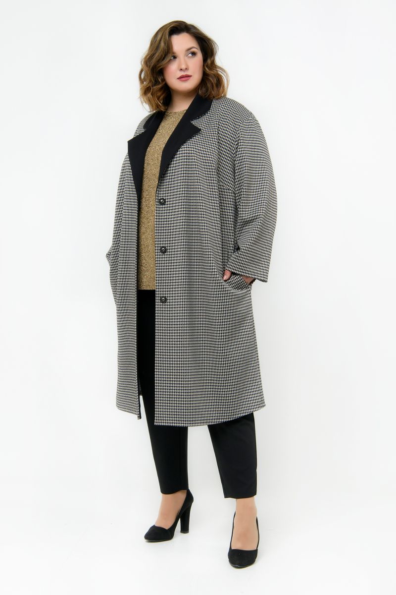 Кардиган - "летнее" пальто "оверсайз", выполнен из трикотажного джерси. Ткань содержит вискозу и небольшой процент эластана. Модель свободная, прямого силуэта, с карманами в боковых швах, застегивается на 3 пришивные кнопки. Лацканы и воротник из ткани-компаньона черного цвета. Рукав длинный.