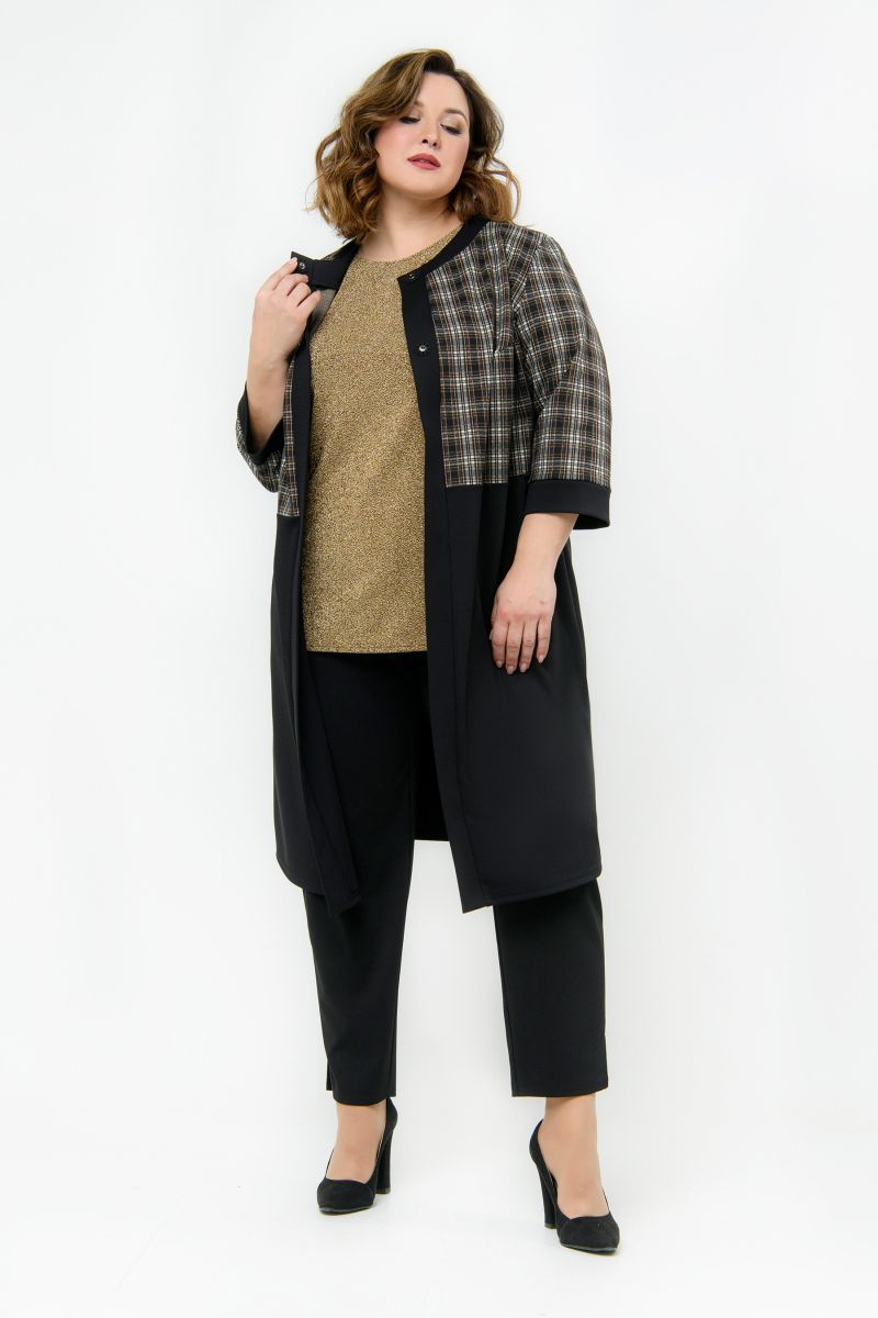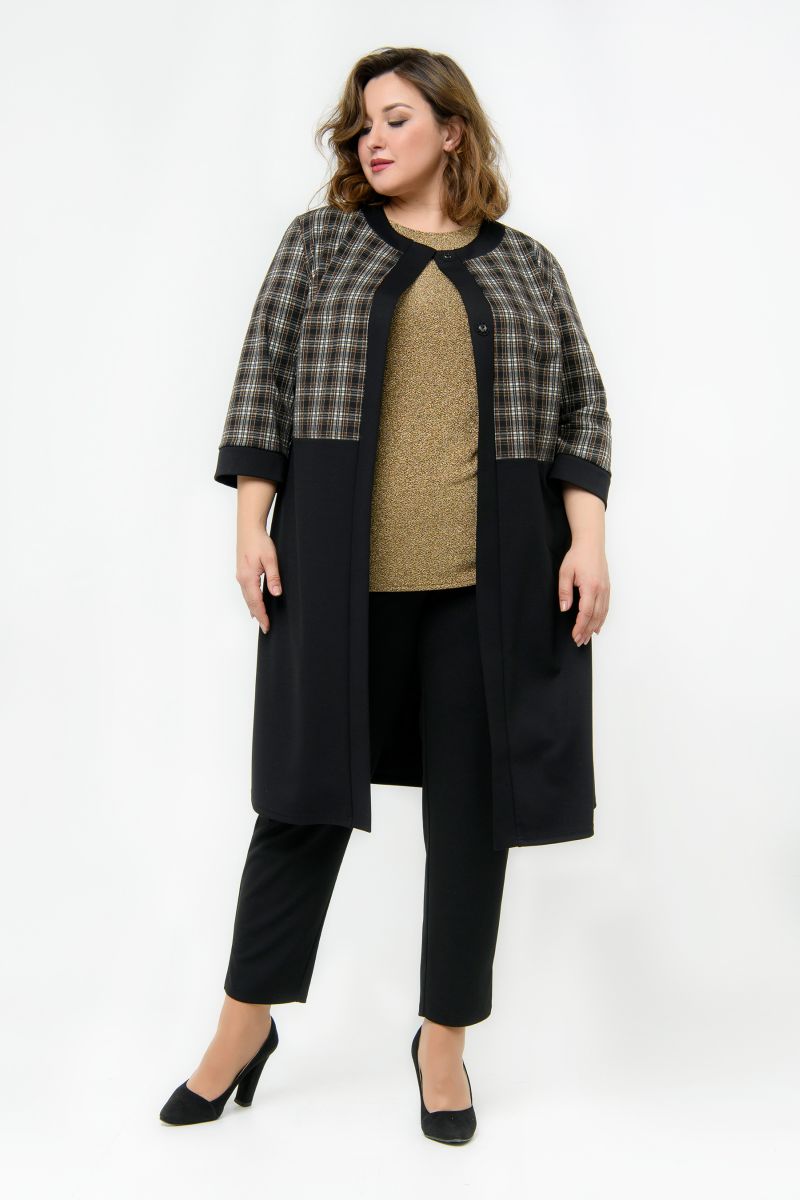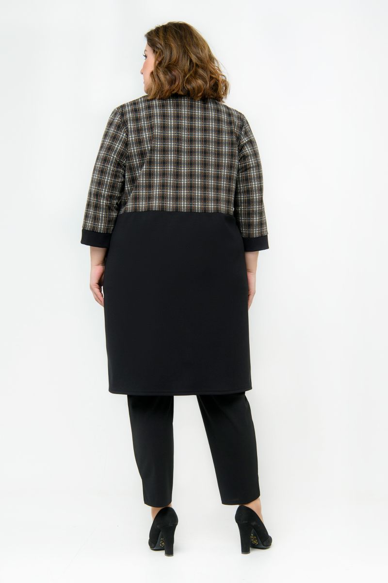 Кардиган прямого силуэта из плотного джерси. Верхняя часть отрезная из клетки шоколадного цвета, нижняя часть и планки черного цвета. Застегивается на две пришивные кнопки в верхней части планки.