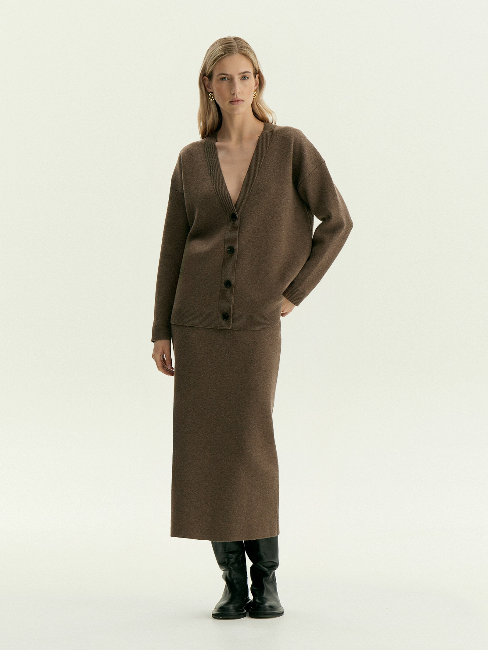 Завершить образ с кардиганом можно юбкой из комплекта.