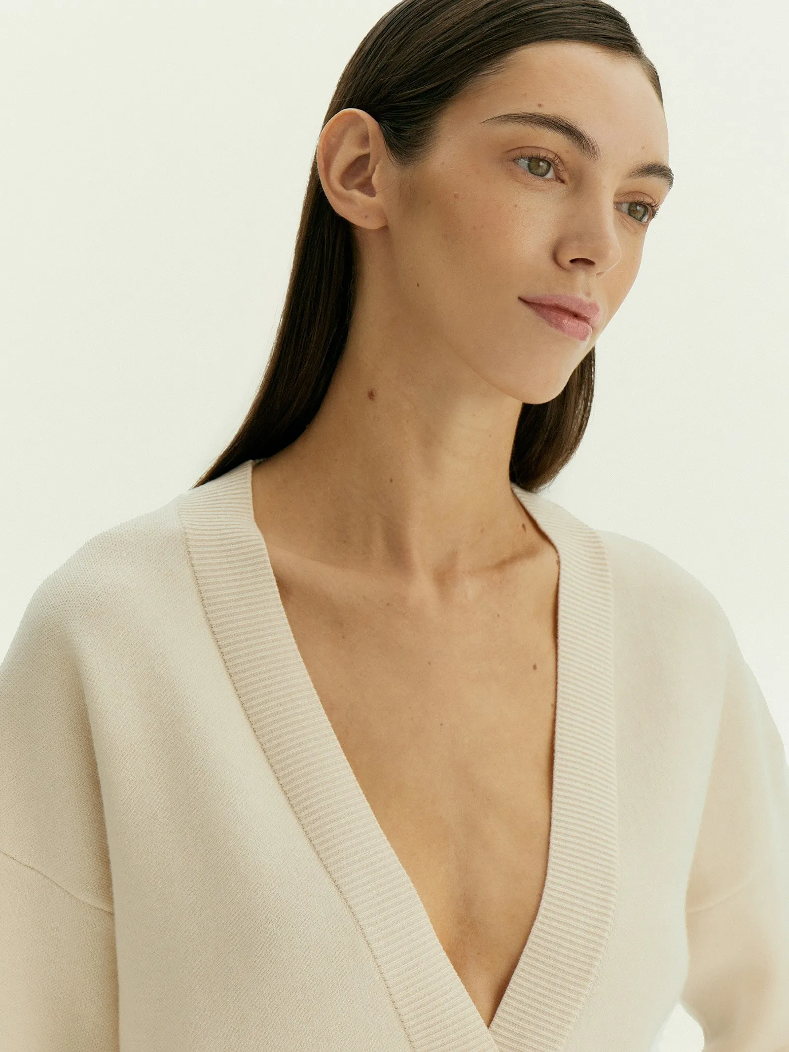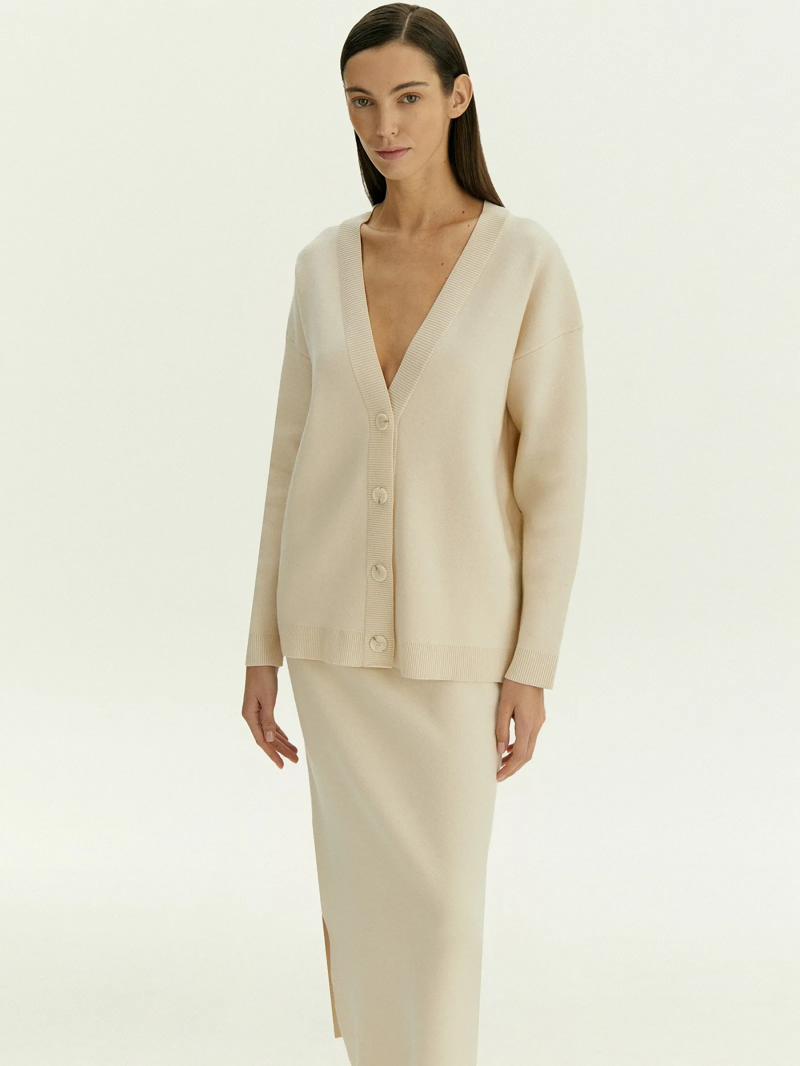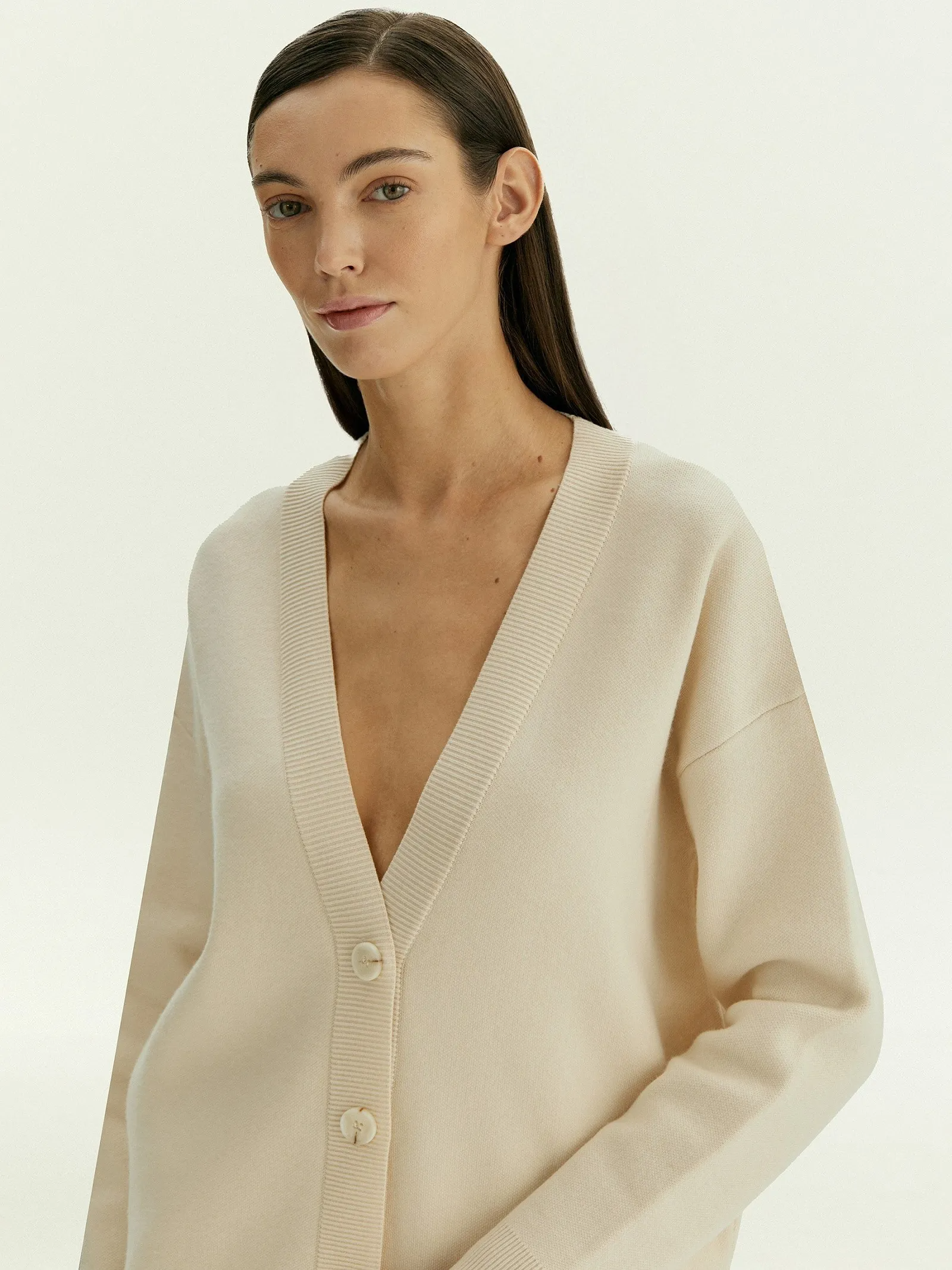 Базовый кардиган в молочном цвете создан для уютных повседневных образов. Его можно надеть и дома, и на работу, и посидеть в кафе.