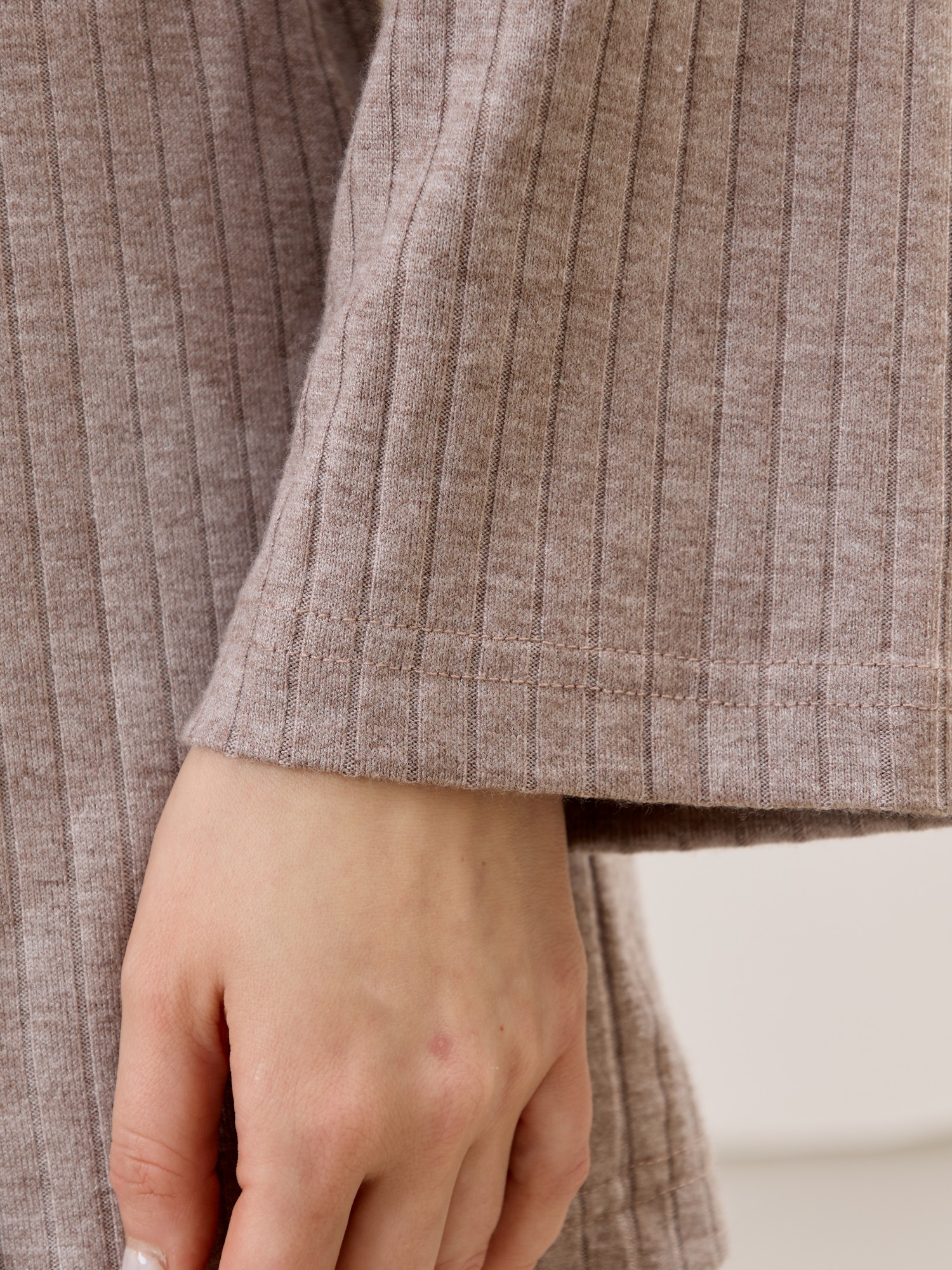 Кардиган-кимоно женский из гладкокрашенного трикотажного фактурного полотна в «рубчик» с добавлением ангоры, на запахе, прямого силуэта, с длинными втачными рукавами. Нижние срезы рукавов, так же низ изделия-обработаны подгибкой, борта полочки и горловина окантованы основным материалом. Изделие укомплектовано съемным поясом, вытачанным из окантовки.