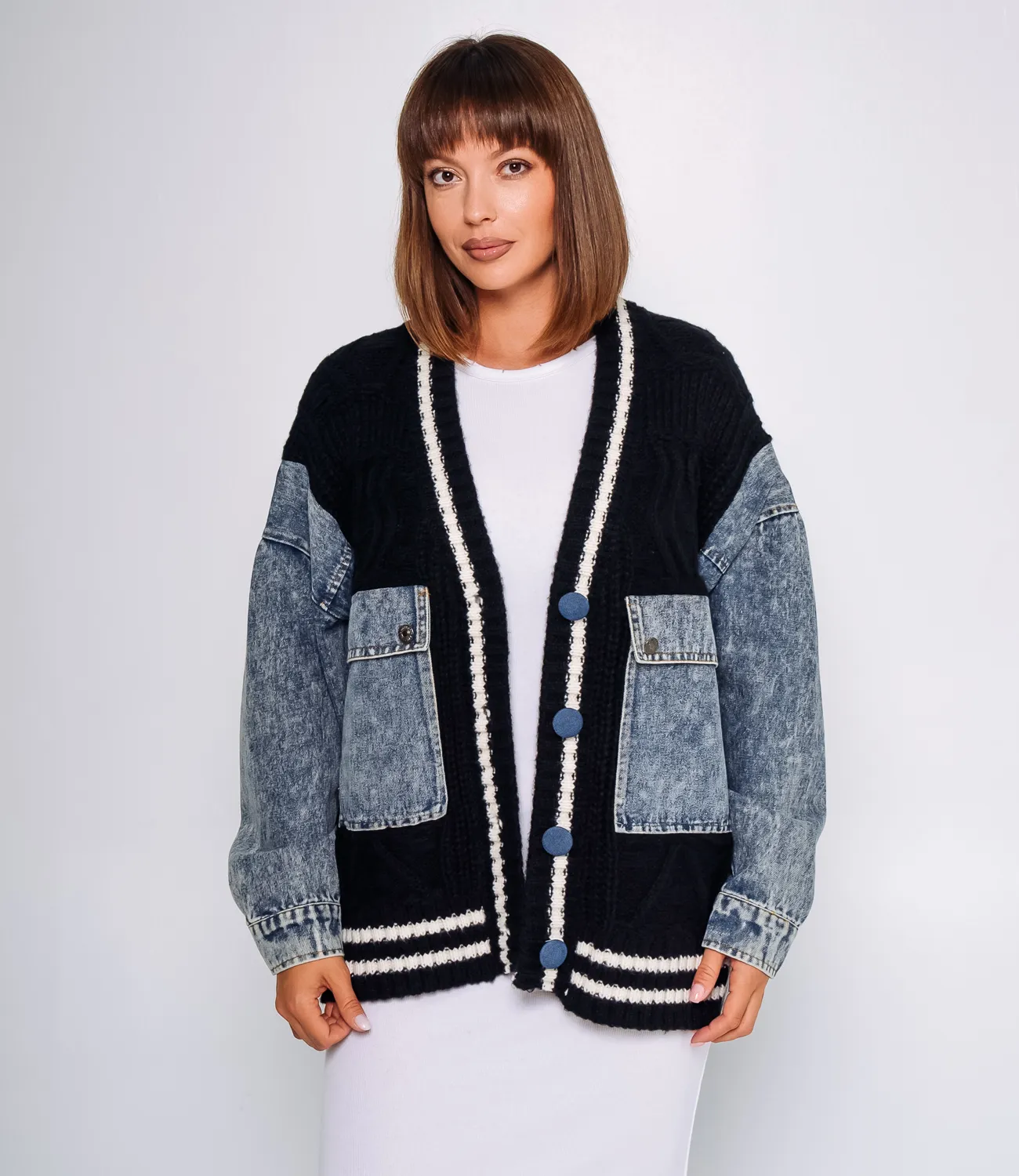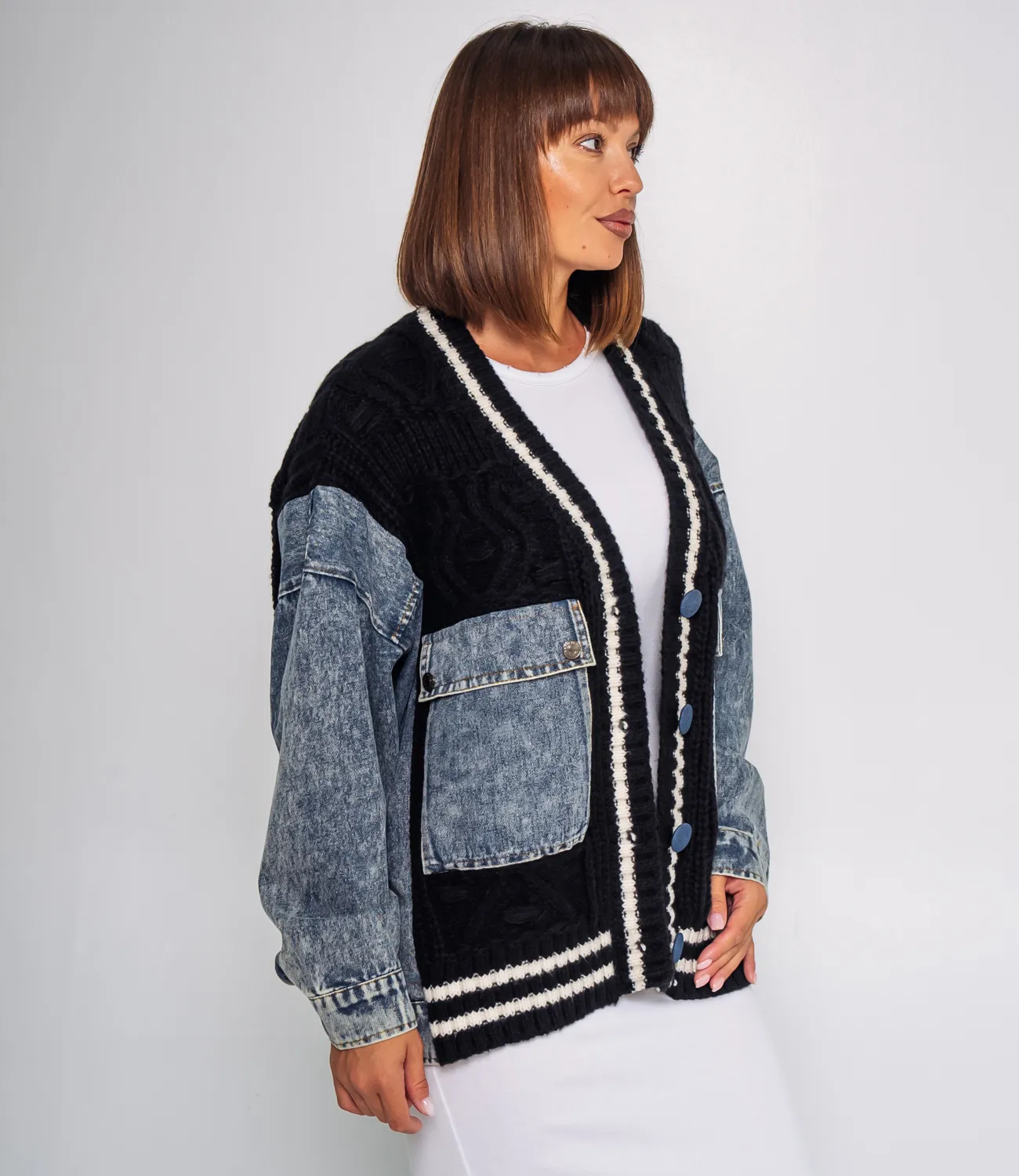 Кардиган - это одежда, которая выделяет женственность любой девушки, подойдет для демисезонного сезона, его выбирают покупательницы, которые ценят сочетание качества и доступной цены, крой подчеркивает изящность фигуры, а джинсовые вставки придают дизайну оригинальсти, производитель знает, как разработать эффектные и стильные решения, для изготовления использована ткань 65% хлопка, 35% полиэстер, которая характеризуется отменным качеством, даже после многих стирок изделие не утратит первоначальной индивидуальности, вы обязательно будете его носить с большим удовольствием, обратите внимание на цвет, он является глубоким и полностью соответствует фотографии на сайте, чтобы вы были уверены в размере, мы представили на странице таблицу, воспользовавшись ею, вы сможете сами сделать мерки и удостовериться, предложенная нами цена является адекватной, не откажите себе в удовольствии быть элегантной!
