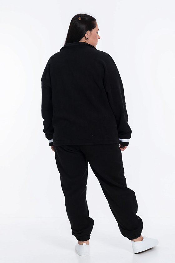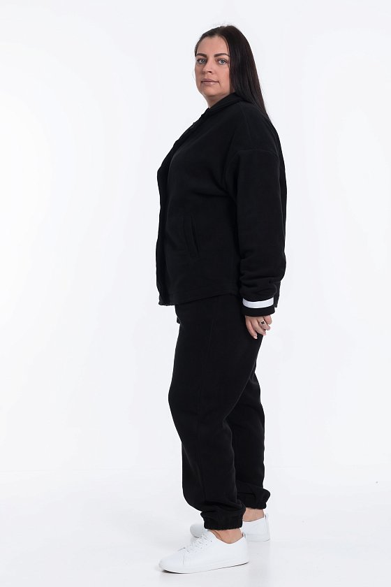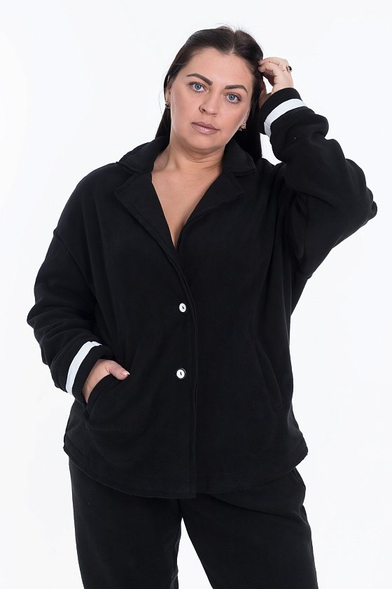 Женский чёрный кардиган из флиса — отличный выбор для прохладной погоды. Воротник с лацканами и спущенная линия плеча придают изделию элегантный вид. Центральная застёжка на 2 пуговицы и отделочные полосы на манжетах контрастного цвета добавляют изысканности. Есть удобные карманы.
