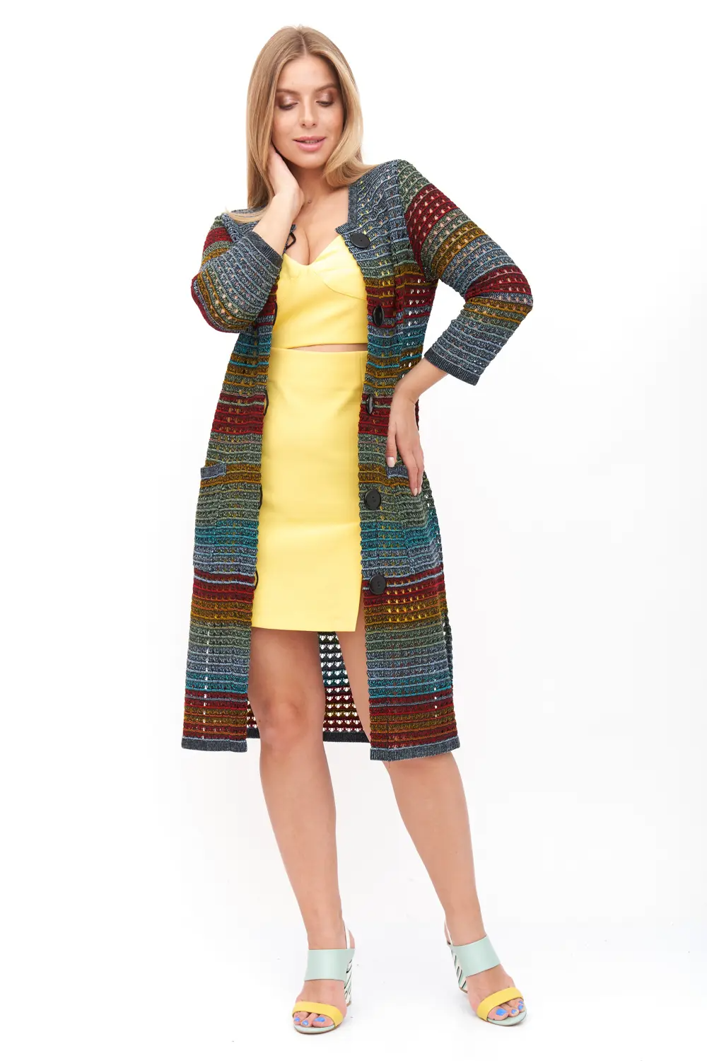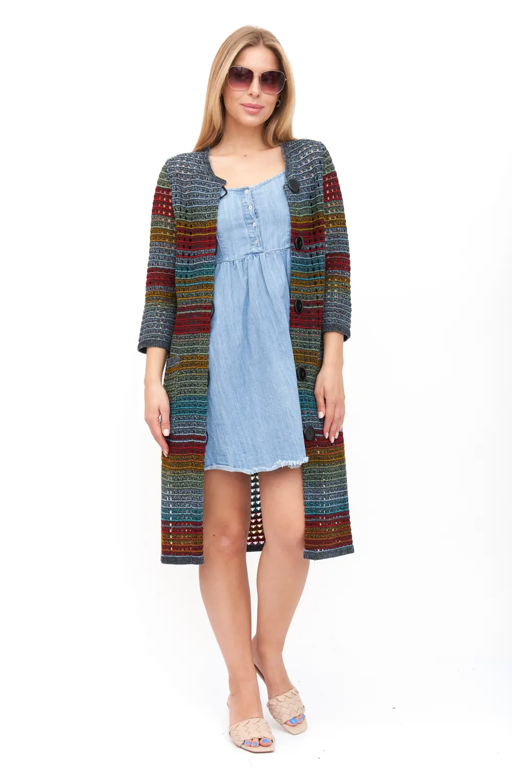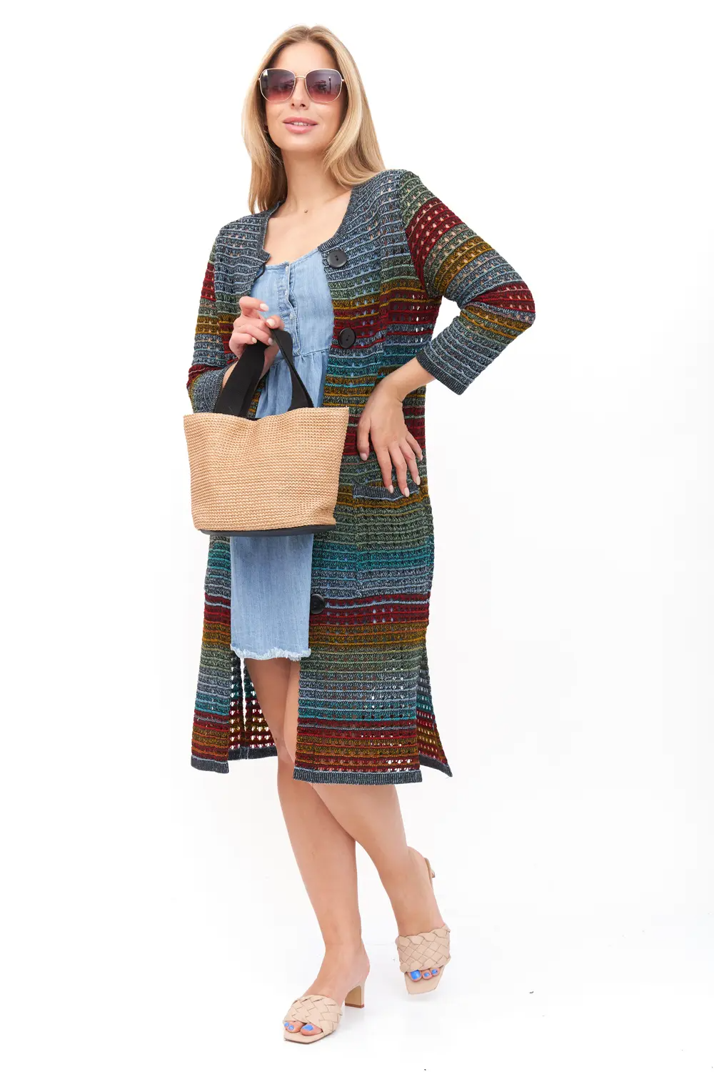 Свободный прямой силуэт и крупная сеточка придают кардигану оригинальную легкость. А цветовая гамма показывает в изделии романтический стиль. Представлена она темными, мягкими тонами и полутонами с нежными переходами от одного цвета в другой. Благодаря такому многоцветию палитра красок подобна радуге после дождя. Горловина кардигана круглая и лёгкая. Небольшие удобные накладные карманы.