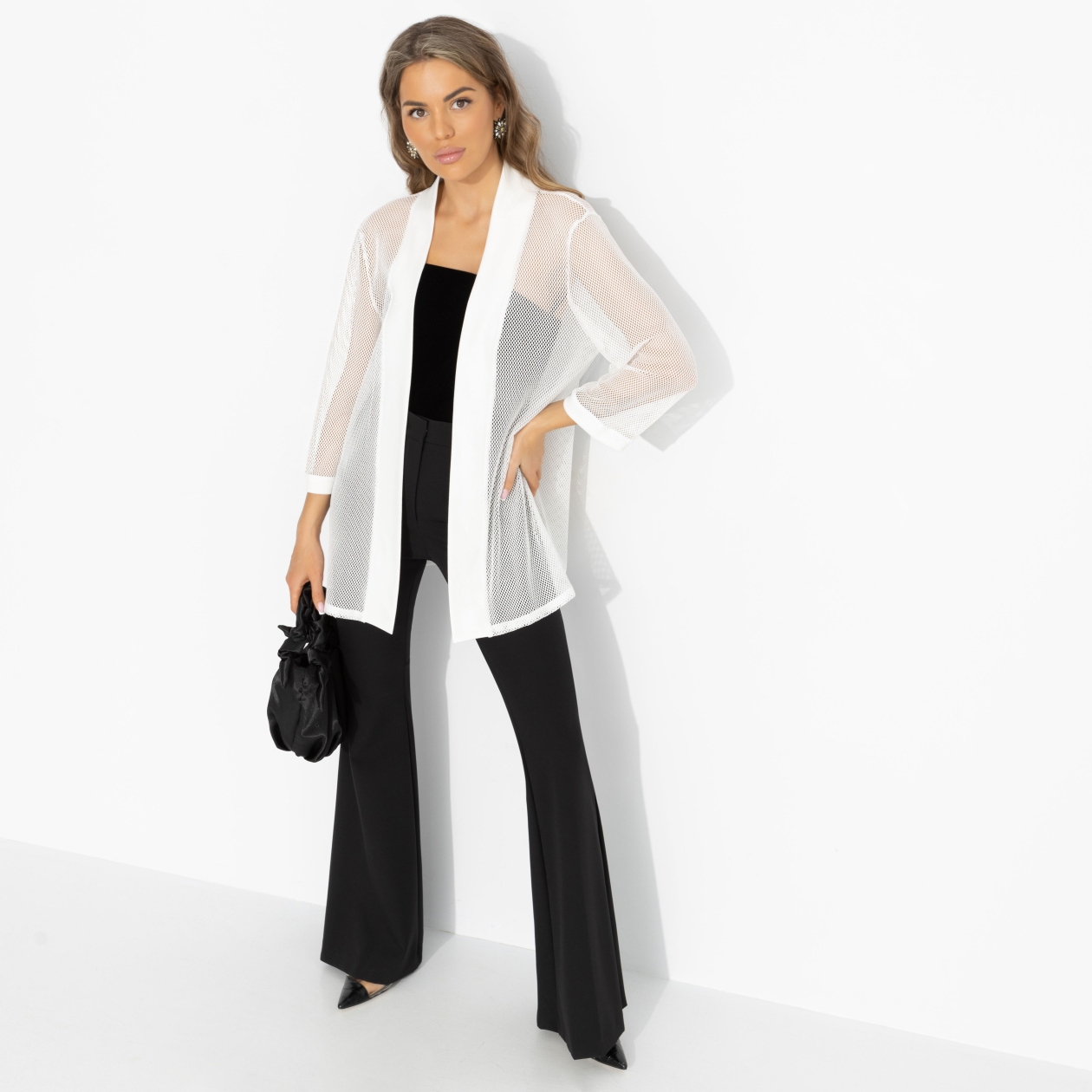 Заметили, как часто в кадрах о бизнесе и важных решениях героиня накидывает что-то на плечи в самый ответственный момент? Белый кардиган – это тот самый приём. Его легко представить на плечах амбициозной Шивон Рой из «Наследников». Лёгкая сетка-стрейч создаёт ощущение прозрачности и многослойности. Кардиган удобно носить поверх платьев, топов и блуз – как финальный штрих. Белый цвет добавляет свежести и визуального света. Подходит для офиса, мероприятий и образов, где важна элегантная недосказанность. Изделие без пояса.