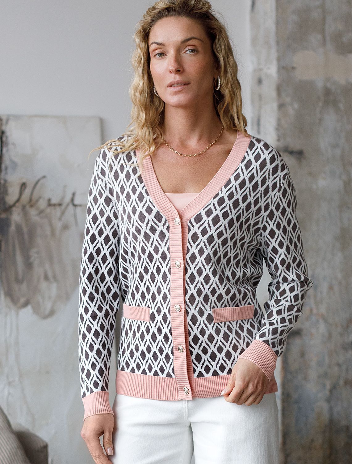 Кардиган с V-вырезом жаккардовой вязки — универсальная и женственная вещь для весны и лета. Жакет кофейно-белого цвета выполнен из приятной к телу вискозы, отличается в меру свободным кроем, который подчеркивает силуэт. V-вырез подчеркивает зону декольте и визуально вытягивает шею, делая фигуру более изящной. Спущенная линия плеча создает расслабленный силуэт, добавляя комфорта и свободы движений, что отлично подойдет для девушек и женщин плюс сайз размеров. Модель на пуговицах обеспечивает удобство в носке и добавляет классическую нотку образу. Контрастная отделка гармонично сочетается с выразительным геометрическим рисунком, который придает образу индивидуальность и современность. Принт немного напоминает благородный орнамент аргайл, Карманы-обманки украшают, сохраняя лаконичность внешнего вида, Кардиган средней длины оптимален для создания разных комбинаций на каждый день. Такой жакет легко впишется в офисный или повседневный образ благодаря своей универсальности и современному стилю. Вискоза дарит ощущение комфорта даже в теплую погоду, а качественная жаккардовая вязка сохраняет форму после стирки.
